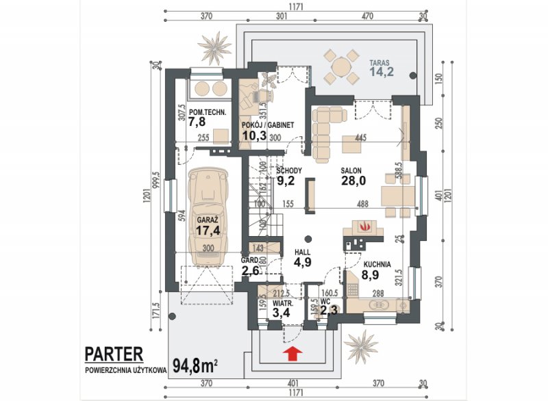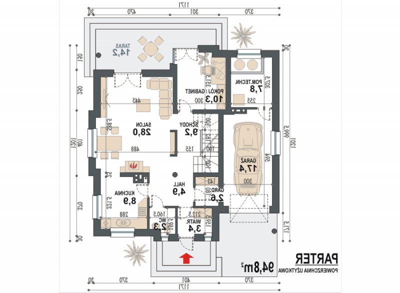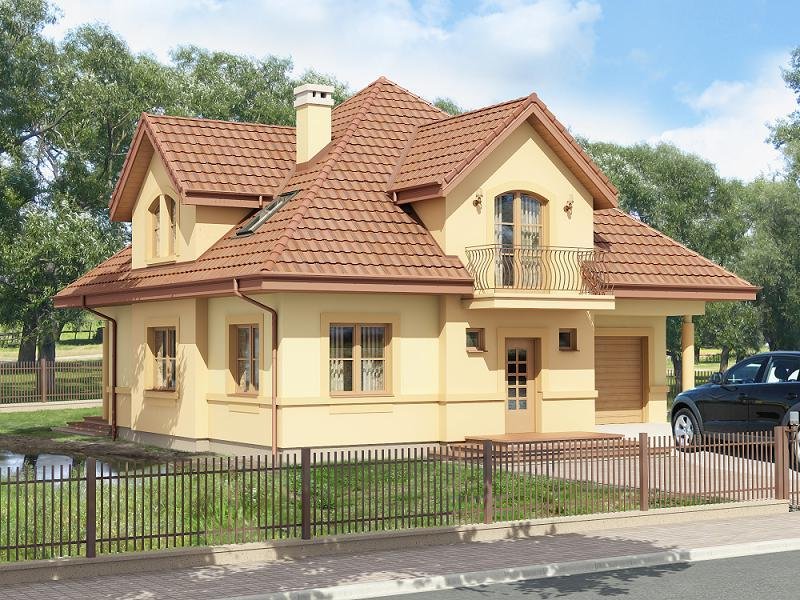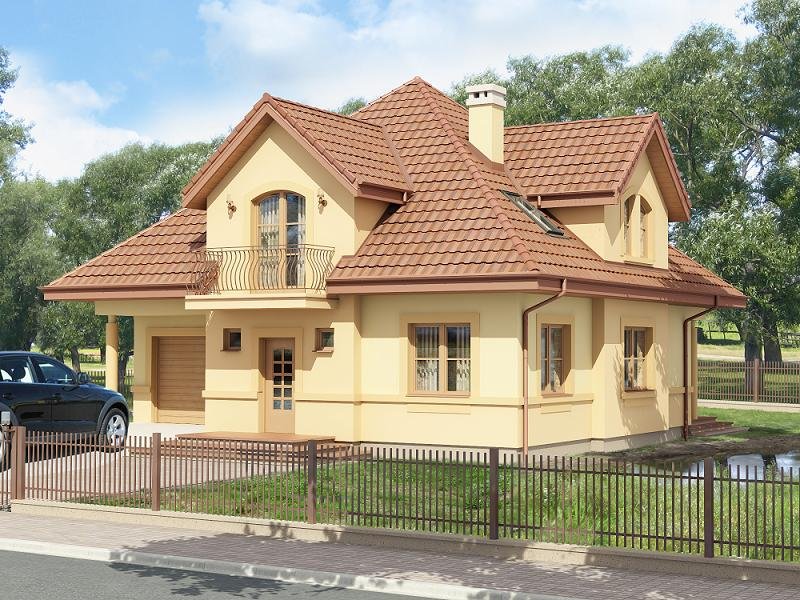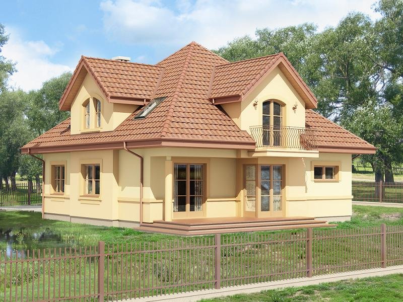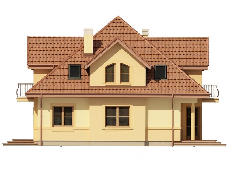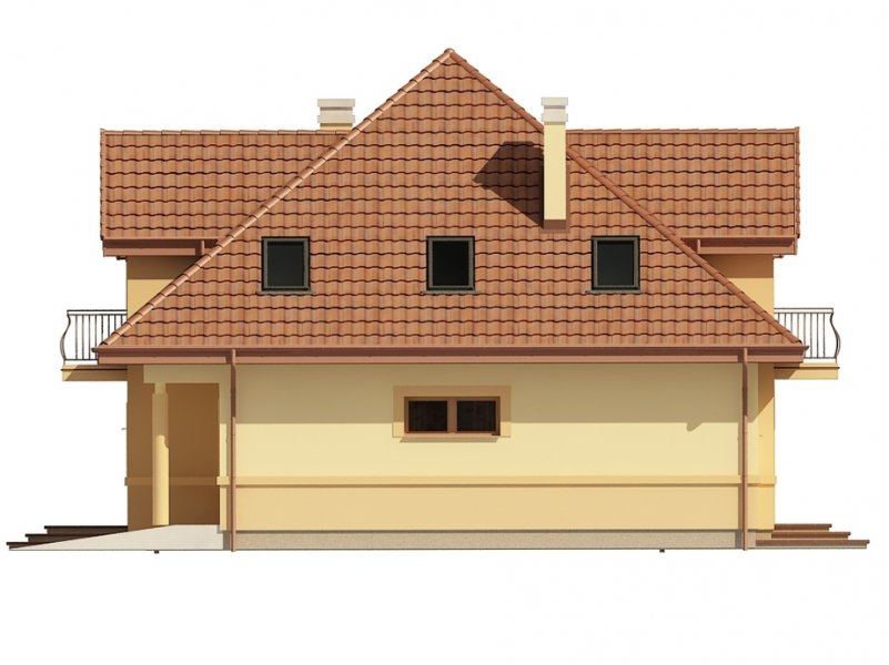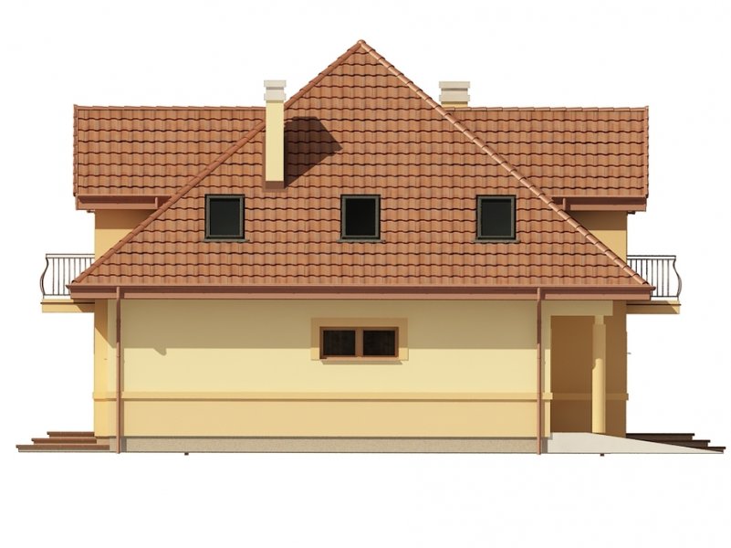 Jednorodzinny dom parterowy z poddaszem użytkowym i garażem jednostanowiskowym, niepodpiwniczony. Przeznaczony dla 4-5 osób. Na parterze zaprojektowano reprezentacyjny salon z kominkiem i jadalnią, otwartą na salon klatkę schodową (z możliwością odgrodzenia), pokój (gabinet), kuchnię , łazienkę, garderobę, kotłownię oraz garaż. Na poddaszu zaprojektowano trzy sypialnie (w tym sypialnia rodziców z własną łazienką oraz garderobą) i łazienkę ogólnodostępną. Cechą charakterystyczną tego domu jest przestronność pomieszczeń oraz zredukowana komunikacja.