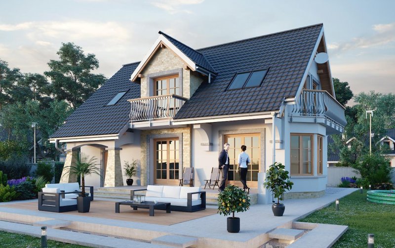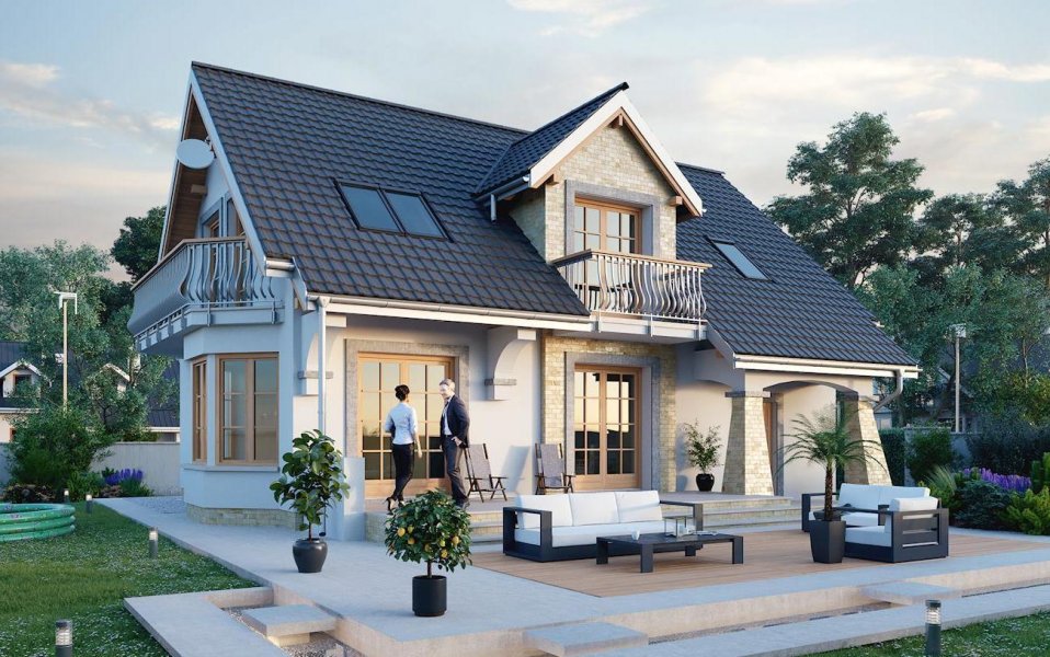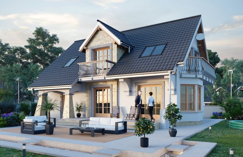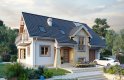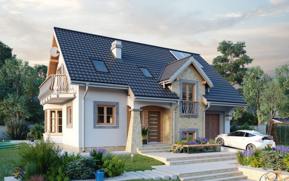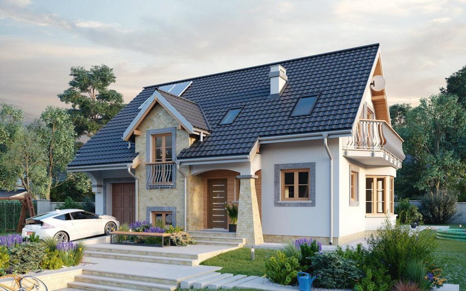 Projekt parterowego domu z użytkowym poddaszem i wbudowanym garażem Fermata Solo cechuje historyzująca architektura. Wspólny dwuspadowy dach z kalenicą równoległą do drogi dojazdowej, przekrywa część mieszkalną i garażową. Front akcentuje dekoracyjny ryzalit z klatką schodową i lukarną, a przy nim wejściowy podcień ze słupem w formie przypory. Podobny detal urozmaica elewację ogrodową na tyłach kotłowni. Parter zaprojektowano tradycyjnie: ściana nośna separuje kuchnię, hol z wc i przejście do garażu od dużego, podłużnego salonu z dwoma wyjściami na taras ogrodowy. Pod schodami wygospodarowano praktyczny schowek. Na poddaszu są cztery pokoje, w tym główna sypialnia z obszerną garderobą, oraz łazienka. Lukarny w każdej połaci, ryzalit jadalni na oktagonalnym planie zwieńczony długim balkonem w ścianie bocznej, razem z malowniczymi arkadami, decydują o niezwykłej atrakcyjności sylwetki Fermaty. Charakter kamieniczki sprawiają, że projekt domu Fermata Solo najlepiej sprawdzi się w osiedlach powstających z zamysłem odtworzenia klimatu miejskich uliczek, podobnie jak warianty do zabudowy bliźniaczej (Fermata Duo) i szeregowej (Fermata).