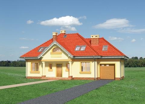Budynek parterowy niepodpiwniczony. Na parterze zlokalizowano sień, hol wejściowy, pokój dzienny połączony jadalnią, dużą kuchnie, spiżarnię, pokój gościnny, łazienkę schody oraz kotłownie z pralnią i garaż. Na poddaszu mieszczą się trzy sypialnie w tym dwie z garderobami oraz łazienka. Bryłę budynku oparto na rzucie prostokąta i nakryto dachem czterospadowym o kącie nachylenia połaci 40°, z dobudowanym z boku garażem przekrytym analogicznym dachem. Wejście główne akcentowane jest gankiem. Z salonu wychodzi na taras przestronne okno kwiatowe.