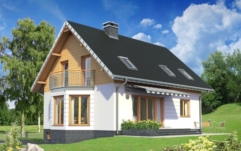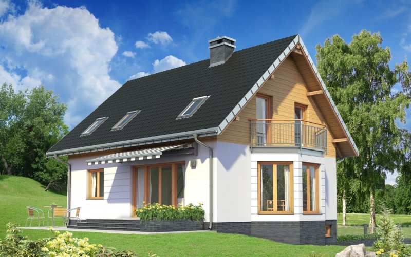 Elewacje: tynk cienkowarstwowy na siatce, częściowe deskowanie;