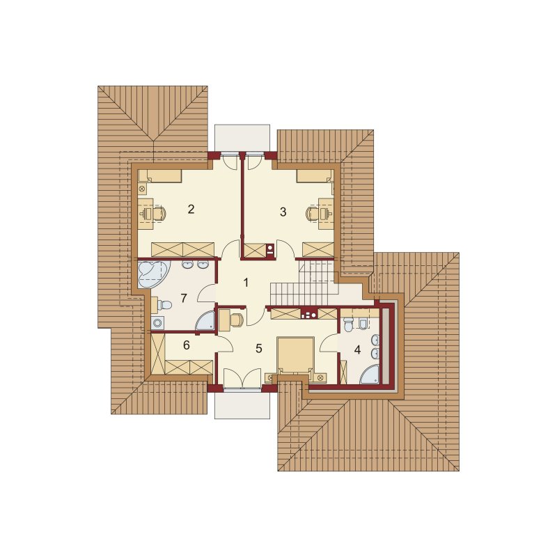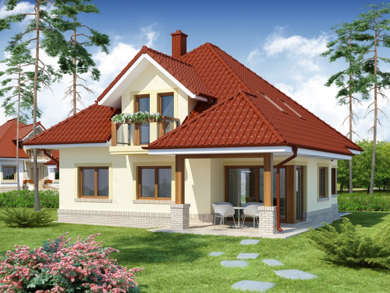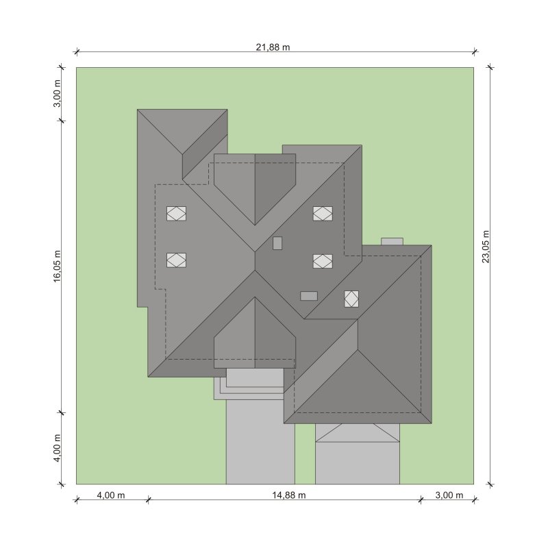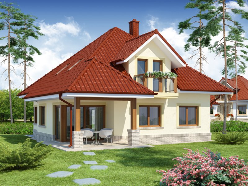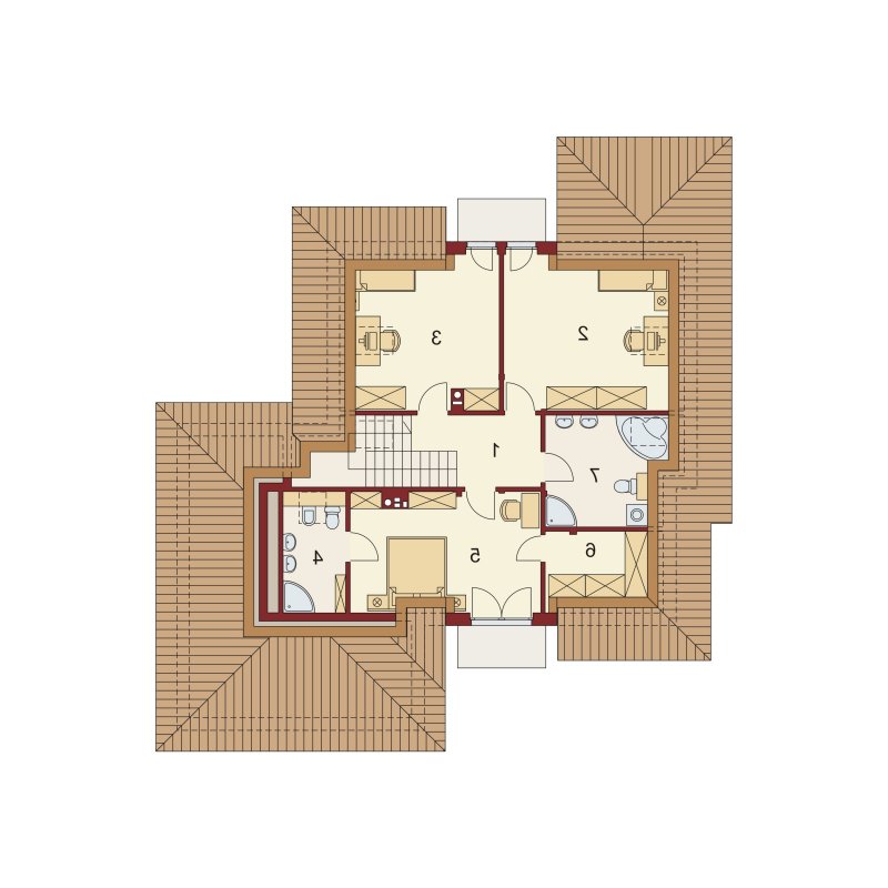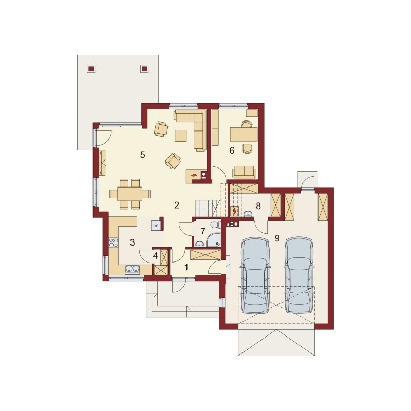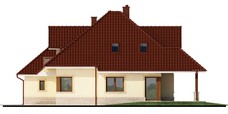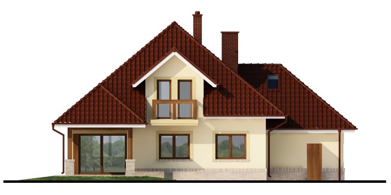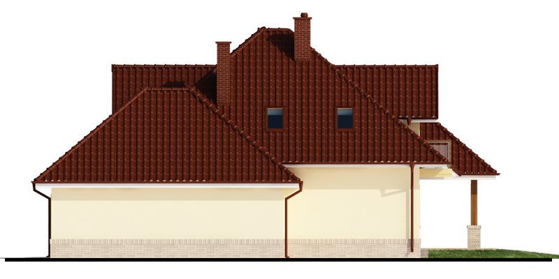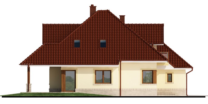 Flawia 2 to dom idealny dla rodziny 4-5 osobowej o klasycznej tradycyjnej bryle. Zaprojektowano go zgodnie z zasadą podziału na strefę dzienną i nocną. Po minięciu wiatrołapu wkracza się do strefy dziennej, gdzie otwiera się przestrzeń z salonem, jadalnią i kuchnią. Salon z kominkiem i wyjściem na taras z dużym zadaszeniem graniczy z częścią jadalnianą, która z kolei bezpośrednio sąsiaduje ze strefą kuchenną. Bardzo dobrze doświetlona kuchnia posiada dostęp do spiżarni. Może ona także funkcjonować jako zamknięta dzięki dostawieniu ścianek działowych. Jeśli chcemy powiększyć kuchnię, bądź zyskać dodatkowe miejsce na szafę w wiatrołapie, możemy to osiągnąć kosztem spiżarni. Na parterze znajduje się także dodatkowy pokój, łazienka z natryskiem oraz garaż i pomieszczenie gospodarcze. Bezpośrednio z wiatrołapu wchodzi się do dwustanowiskowego garażu, z którego z kolei zaaranżowano wyjście do ogrodu oraz dostęp do pomieszczenia gospodarczego. Jest możliwość powiększenia tego ostatniego prawie dwukrotnie, wykorzystując przestrzeń przy drzwiach wychodzących na ogród. Poddasze to w całości strefa nocna. Składa się z trzech sypialni, każda z wyjściem na balkon, a jedna dodatkowo z indywidualną łazienką i garderobą oraz z łazienki.