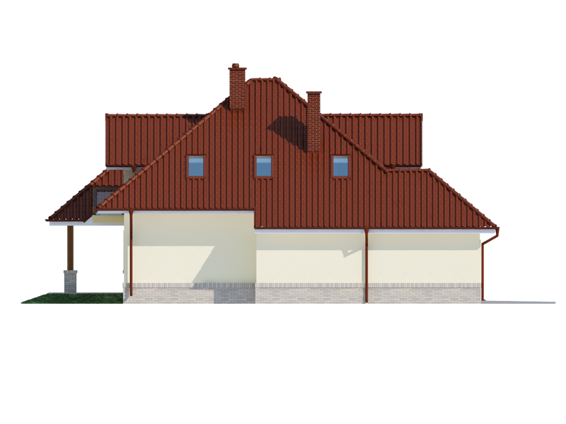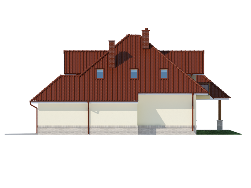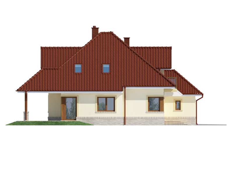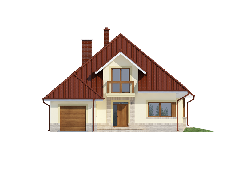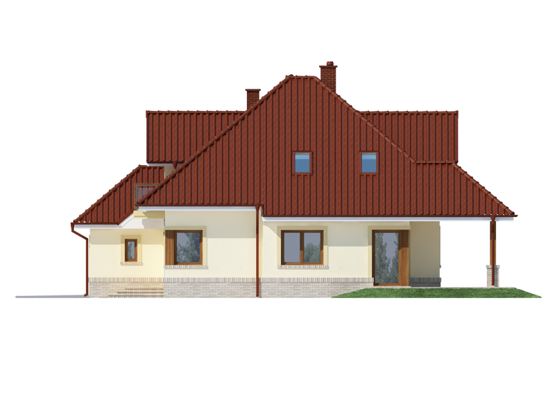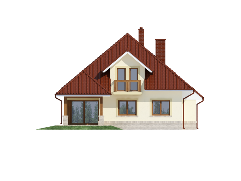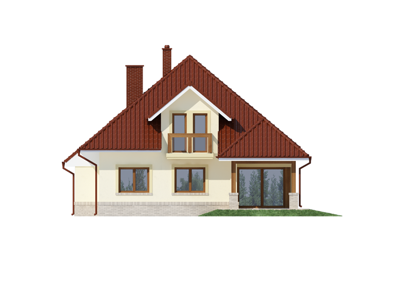 Flawia to dom idealny dla rodziny 4-5 osobowej o klasycznej tradycyjnej bryle. Zaprojektowano go zgodnie z zasadą podziału na strefę dzienną i nocną. Po minięciu wiatrołapu wkracza się do strefy dziennej, gdzie otwiera się przestrzeń z salonem, jadalnią i kuchnią. Salon z kominkiem i wyjściem na taras z dużym zadaszeniem graniczy z częścią jadalnianą, która z kolei bezpośrednio sąsiaduje ze strefą kuchenną. Bardzo dobrze doświetlona kuchnia posiada dostęp do spiżarni. Może ona także funkcjonować jako zamknięta dzięki dostawieniu ścianek działowych. Jeśli chcemy powiększyć kuchnię, bądź zyskać dodatkowe miejsce na szafę w wiatrołapie, możemy to osiągnąć kosztem spiżarni. Na parterze znajduje się także dodatkowy pokój, łazienka z natryskiem oraz garaż i pomieszczenie gospodarcze. Bezpośrednio z wiatrołapu wchodzi się do jednostanowiskowego garażu, z którego z kolei zaaranżowano dostęp do pomieszczenia gospodarczego. Poddasze to w całości strefa nocna. Składa się z przestronnej łazienki oraz trzech sypialni- każdej z wyjściem na balkon, a jednej dodatkowo z indywidualną garderobą.