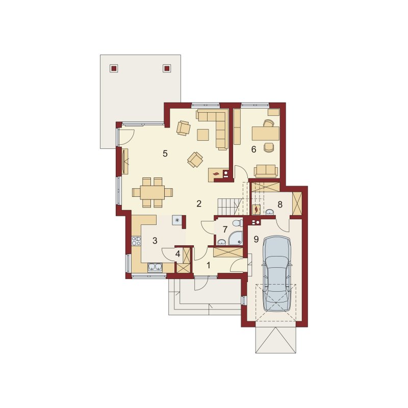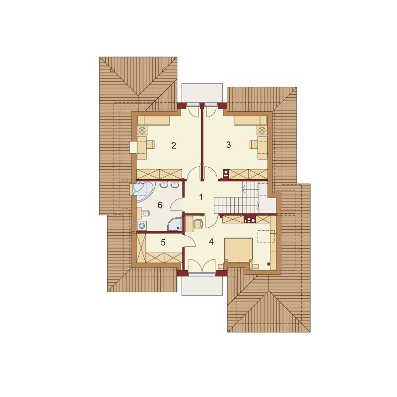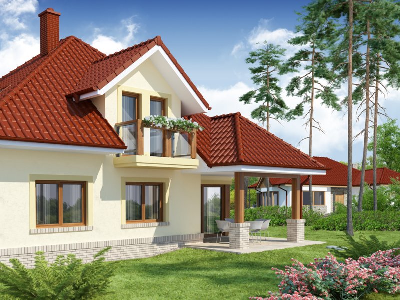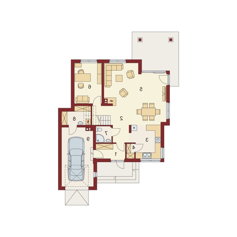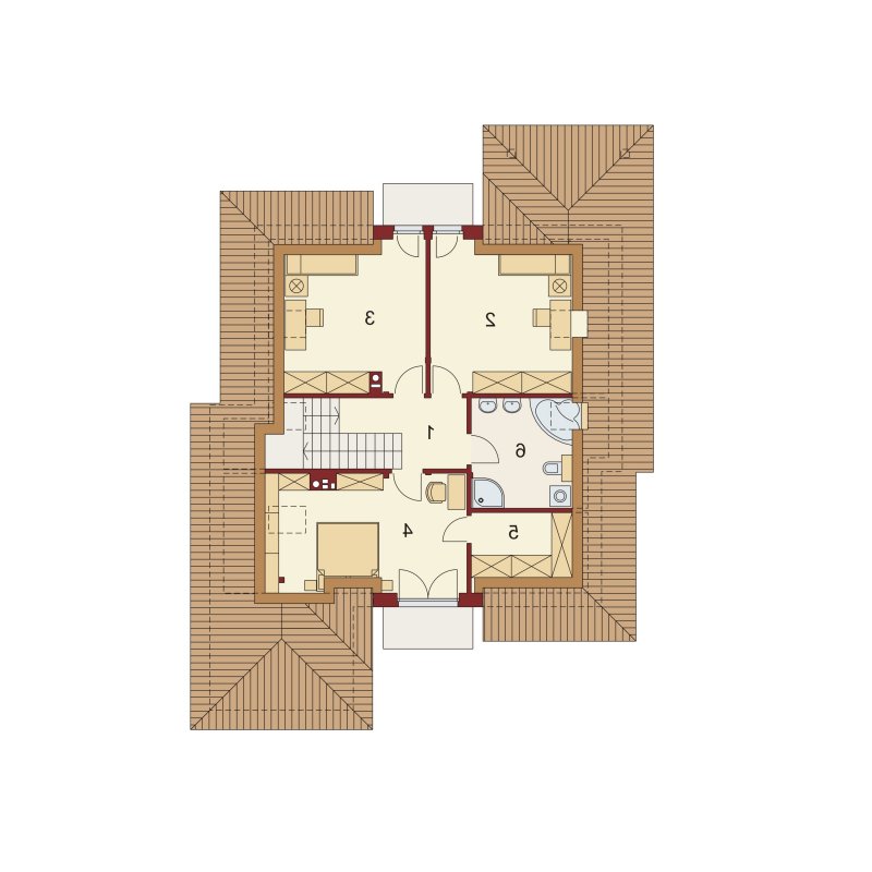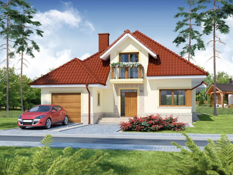 Flawia to dom idealny dla rodziny 4-5 osobowej o klasycznej tradycyjnej bryle. Zaprojektowano go zgodnie z zasadą podziału na strefę dzienną i nocną. Po minięciu wiatrołapu wkracza się do strefy dziennej, gdzie otwiera się przestrzeń z salonem, jadalnią i kuchnią. Salon z kominkiem i wyjściem na taras z dużym zadaszeniem graniczy z częścią jadalnianą, która z kolei bezpośrednio sąsiaduje ze strefą kuchenną. Bardzo dobrze doświetlona kuchnia posiada dostęp do spiżarni. Może ona także funkcjonować jako zamknięta dzięki dostawieniu ścianek działowych. Jeśli chcemy powiększyć kuchnię, bądź zyskać dodatkowe miejsce na szafę w wiatrołapie, możemy to osiągnąć kosztem spiżarni. Na parterze znajduje się także dodatkowy pokój, łazienka z natryskiem oraz garaż i pomieszczenie gospodarcze. Bezpośrednio z wiatrołapu wchodzi się do jednostanowiskowego garażu, z którego z kolei zaaranżowano dostęp do pomieszczenia gospodarczego. Poddasze to w całości strefa nocna. Składa się z przestronnej łazienki oraz trzech sypialni- każdej z wyjściem na balkon, a jednej dodatkowo z indywidualną garderobą.