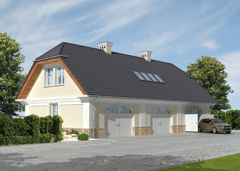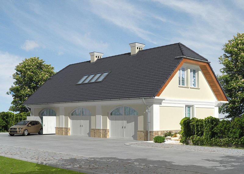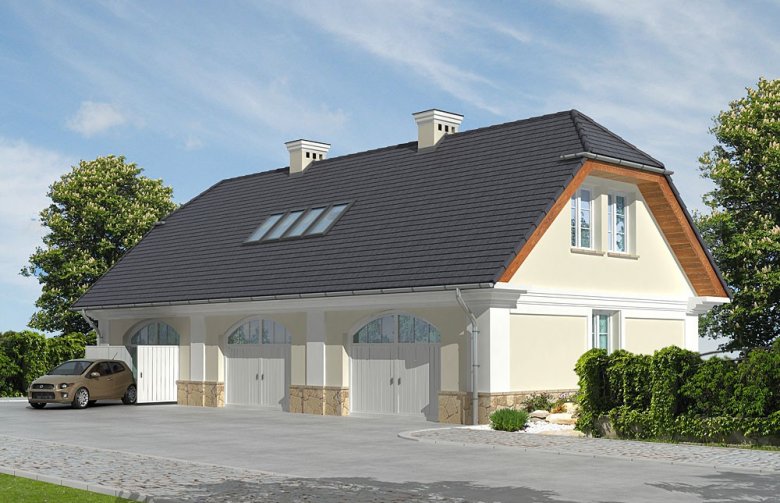 Wolnostojący garaż dwustanowiskowy z poddaszem użytkowym.