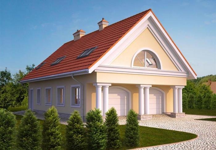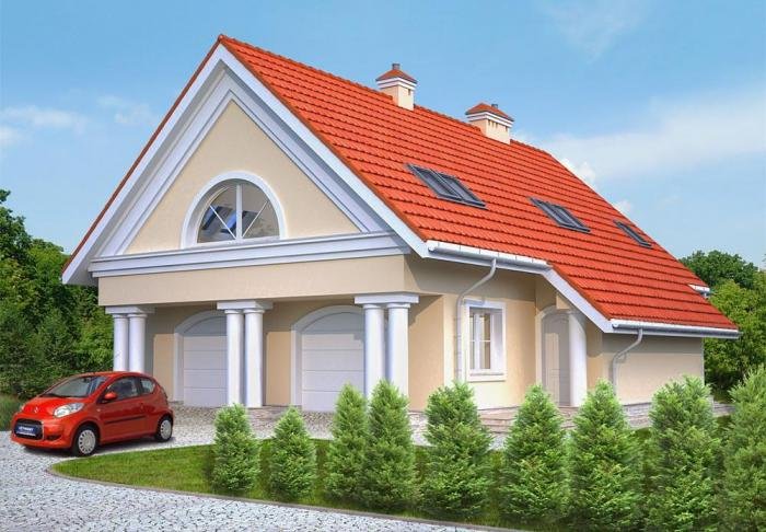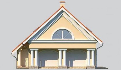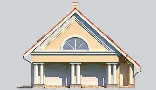 Projekt budynku garażowego z poddaszem mieszkalnym. Na parterze znajduję się dwustanowiskowy garaż, a także duża kotłownia . Na poddaszu natomiast została zaprojektowana kuchnia z jadalnią, łazienka i pokój gościnny