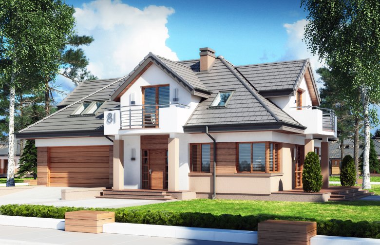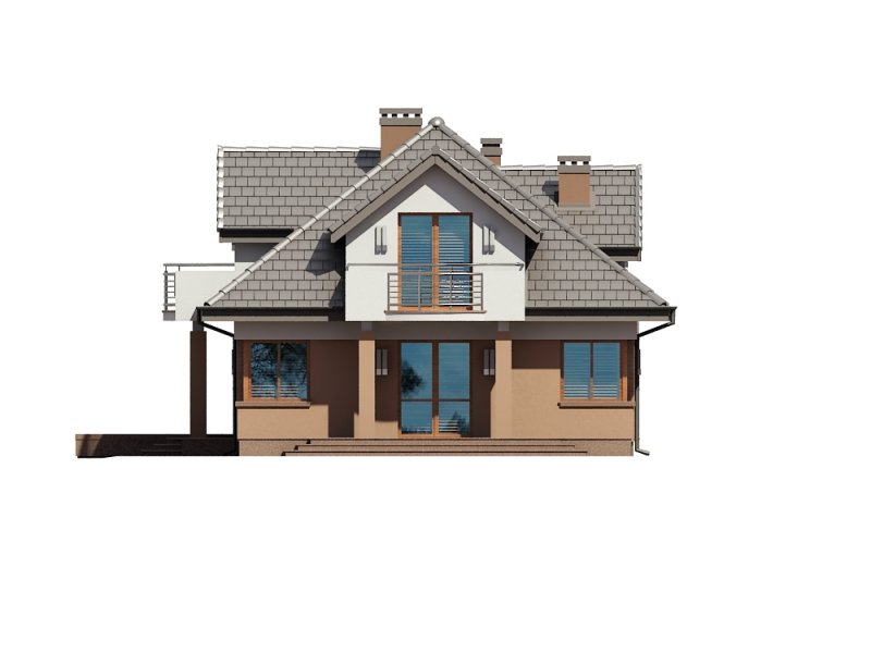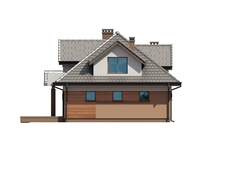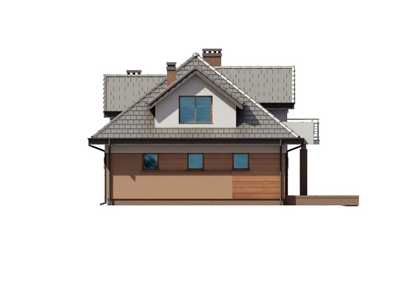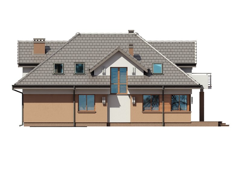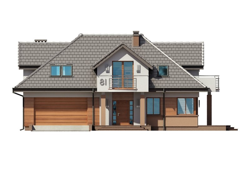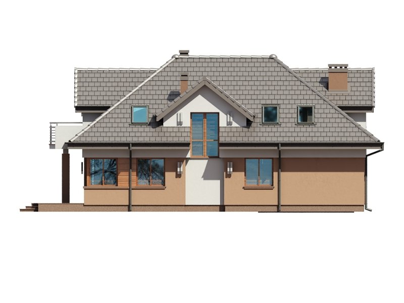 Dom ten to ciekawa propozycja projektu domu parterowego z użytkowym poddaszem przeznaczonego dla 5-7 osobowej rodziny. Budynek posiada reprezentacyjne wejście podkreślone balkonem wspartym na dwóch kolumnach. Na parterze w strefie dziennej budynku poprzez otwarcie kuchni z aneksem jadalnym oraz hallu na salon uzyskano jedną wielką przestrzeń o przenikających się funkcjach użytkowych. Program parteru uzupełniają: pokój (gabinet), ogólnodostępne wc, garderoba oraz dwustanowiskowy garaż z kotłownią (pomieszczeniem gospodarczym). Strefa nocna sytuowana na poddaszu użytkowym budynku składa się z 3 sypialni oraz ogólnodostępnej łazienki i garderoby. Sypialnia przeznaczona dla rodziców posiada dodatkową łazienkę i garderobę, z którymi stanowi oddzielną, intymną strefę. Duży taras oraz dwa balkony na poddaszu przynależne do sypialni umożliwiają doskonały kontakt z przyrodą przydomową co jest szczególnie ważną zaletą dla miłośników mieszkania w otoczeniu natury.