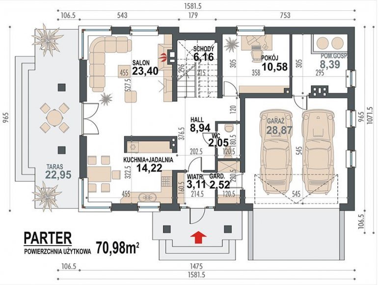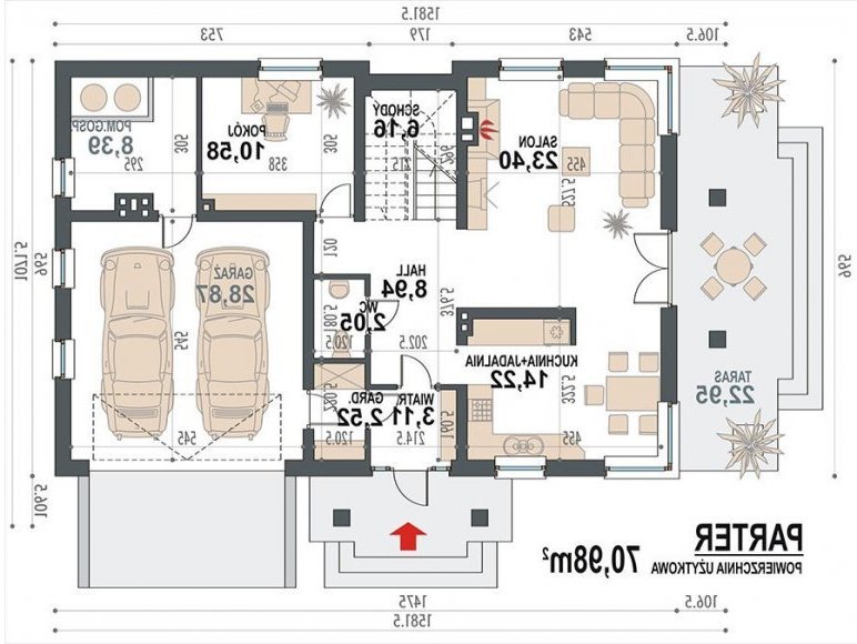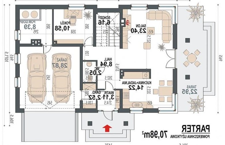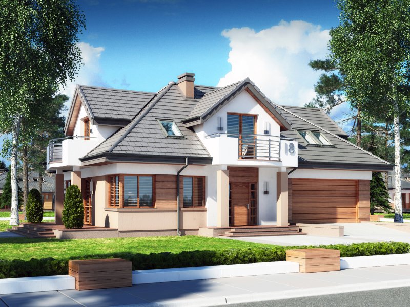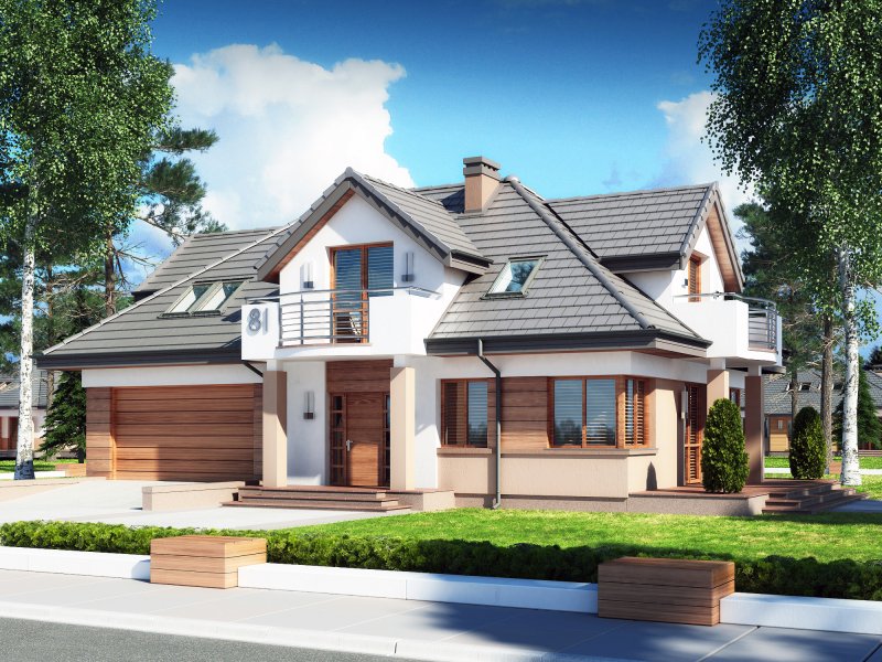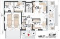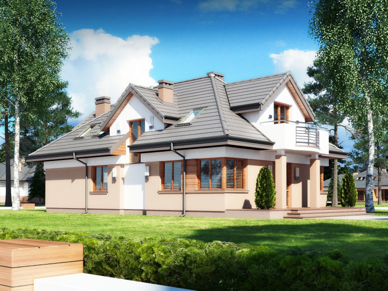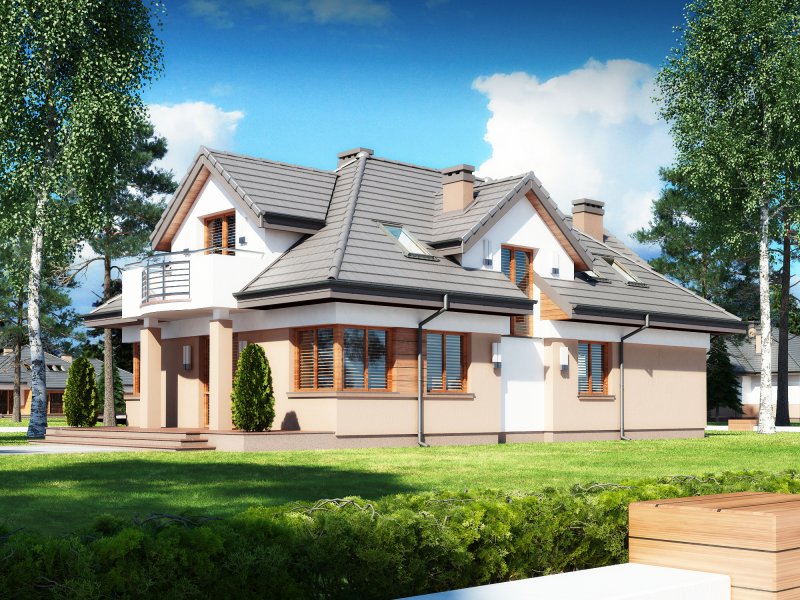 Dom ten to ciekawa propozycja projektu domu parterowego z użytkowym poddaszem przeznaczonego dla 5-7 osobowej rodziny. Budynek posiada reprezentacyjne wejście podkreślone balkonem wspartym na dwóch kolumnach. Na parterze w strefie dziennej budynku poprzez otwarcie kuchni z aneksem jadalnym oraz hallu na salon uzyskano jedną wielką przestrzeń o przenikających się funkcjach użytkowych. Program parteru uzupełniają: pokój (gabinet), ogólnodostępne wc, garderoba oraz dwustanowiskowy garaż z kotłownią (pomieszczeniem gospodarczym). Strefa nocna sytuowana na poddaszu użytkowym budynku składa się z 3 sypialni oraz ogólnodostępnej łazienki i garderoby. Sypialnia przeznaczona dla rodziców posiada dodatkową łazienkę i garderobę, z którymi stanowi oddzielną, intymną strefę. Duży taras oraz dwa balkony na poddaszu przynależne do sypialni umożliwiają doskonały kontakt z przyrodą przydomową co jest szczególnie ważną zaletą dla miłośników mieszkania w otoczeniu natury.
