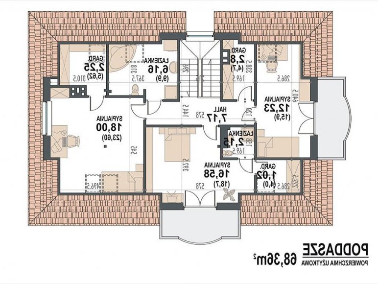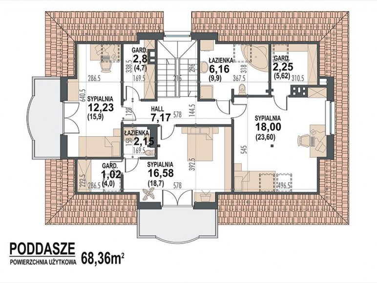 | dach | o konstrukcji drewnianej, pokryty dachówką ceramiczną, cementową lub blachodachówką |