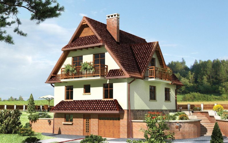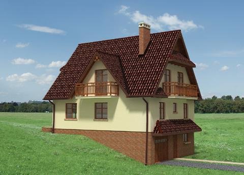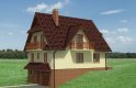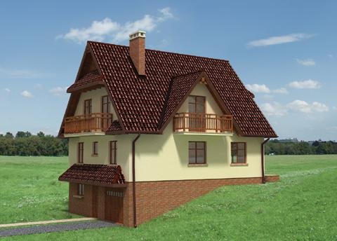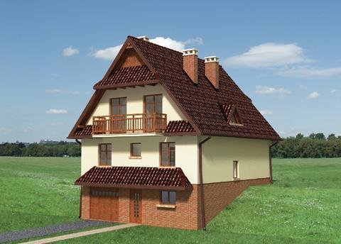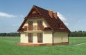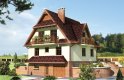 Wejście przez sień w przyziemiu do holu. Na prawo wejście do garażu, na lewo - pralnia z kotłownią. Klatką schodową wchodzimy na właściwy poziom mieszkalny - parter. Na wprost znajduje się wejście do jadalni, na lewo do pokoju dziennego, a na prawo do kuchni, łazienki i pokoju gościnnego. Na poddaszu zlokalizowano 4 pokoje sypialne, w.c. i łazienkę. Wjazd do garażu z poziomu terenu. Dom nawiązuje w swej formie do architektury Podhala. Jest rzadką propozycją zabudowy dla terenu o większym spadku. Strzeliste dachy o kącie nachylenia połaci 50°, malownicze daszki w szczytach elewacji oraz charakterystyczny układ funkcjonalny stanowią o niepowtarzalności tego domu.