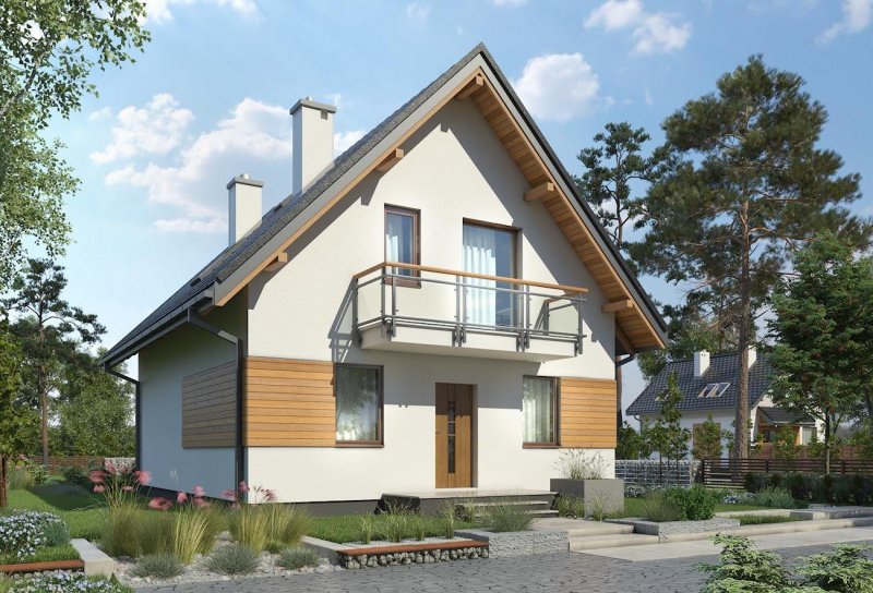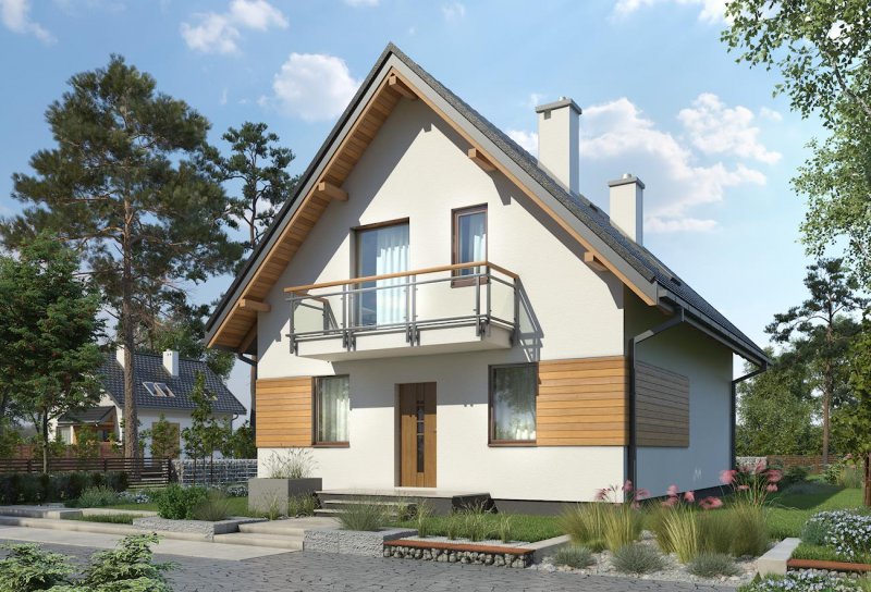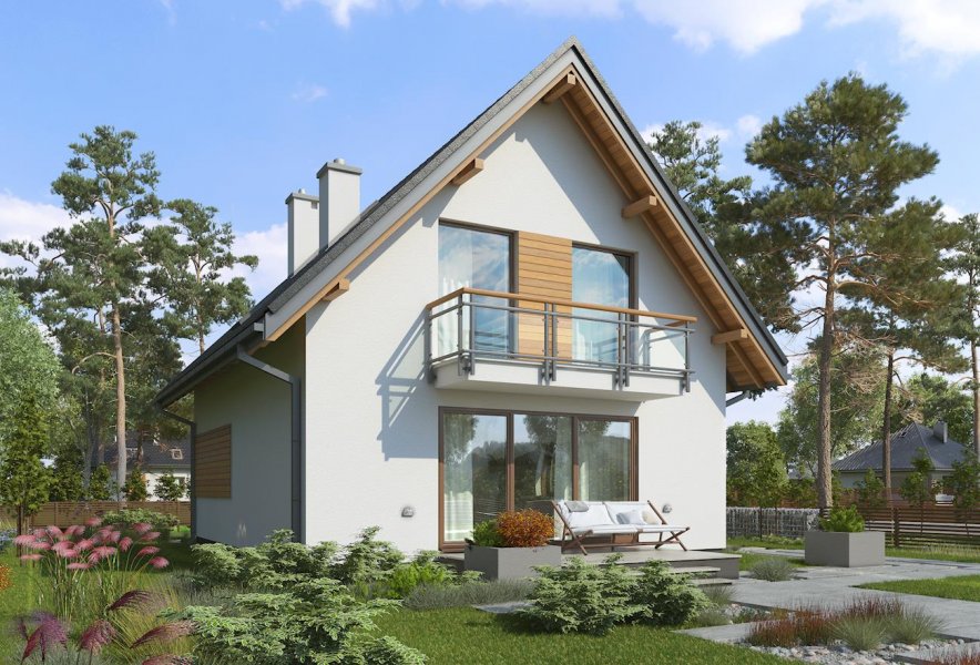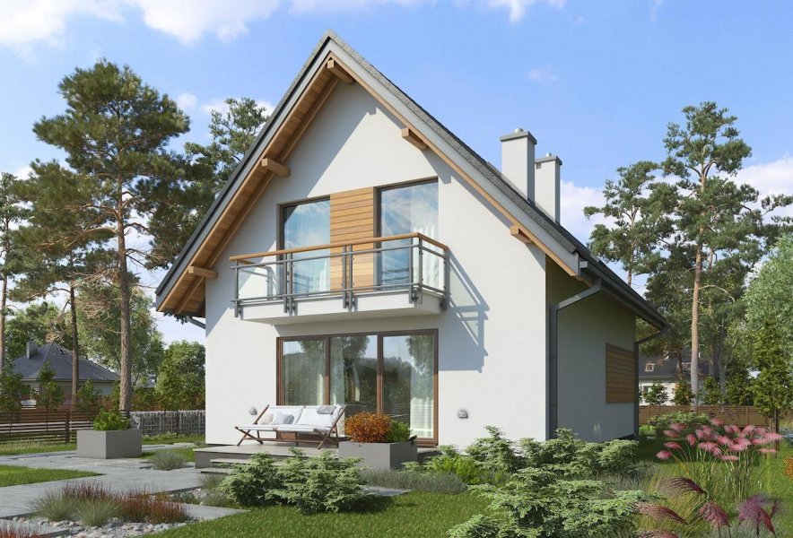 Projekty małych domów powstają głównie na niewielkie lub wąskie działki, gdzie liczy się kształt rzutu i każdy decymetr wymiaru, zmieniający jego proporcje. Spośród takich domów, o powierzchni użytkowej ok. 100m2, bez garażu, z kalenicą prostopadłą do drogi wjazdowej, projekt domu Grześ ma, w ofercie Archetonu, najprostszy i najmniej wydłużony zarys. Przekryto go bardzo stromym dachem (45°), co pozwala spełnić wymogi ochrony krajobrazu w terenach górskich. Energooszczędna, zwarta bryła zamyka mieszkanie dla 4 osób. Na parterze zaplanowano pokój dzienny z dużą kuchnią i kotłownię. Rozpiętość ścian niosących dwuspadowy dach pozwoliła na ulokowanie pod nim trzech wygodnych sypialni z dużą łazienką. Projekt domu Grześ ma neutralny, prosty detal architektoniczny, co pozostawia dużą swobodę zmian w wyglądzie elewacji. Balkony w ścianach szczytowych stanowią jedyne urozmaicenie prostej sylwetki i jednocześnie osłony wejść do budynku. Markiza zamocowana od ogrodu do czoła płyty pozwoli ochronić efektowne przeszklenie salonu i taras i przed letnim skwarem.