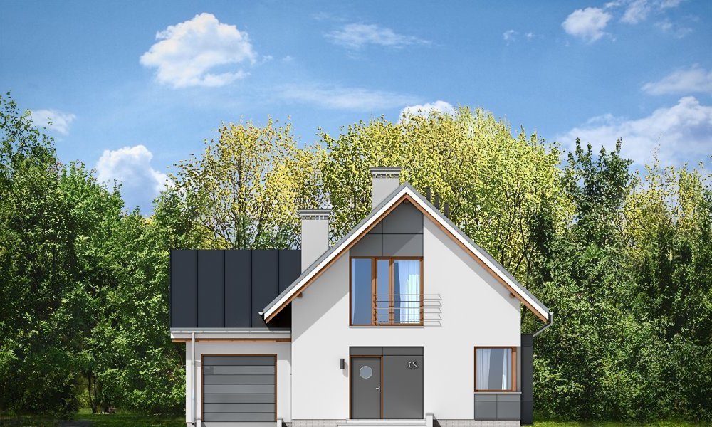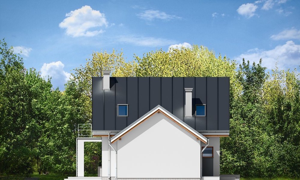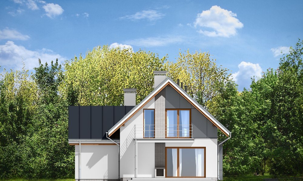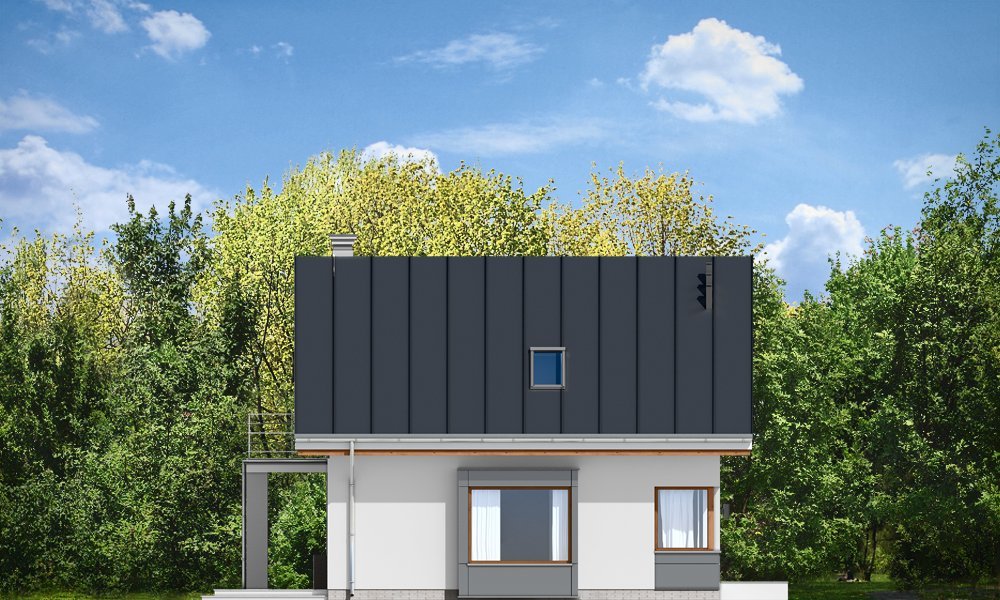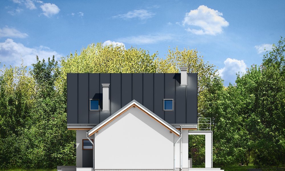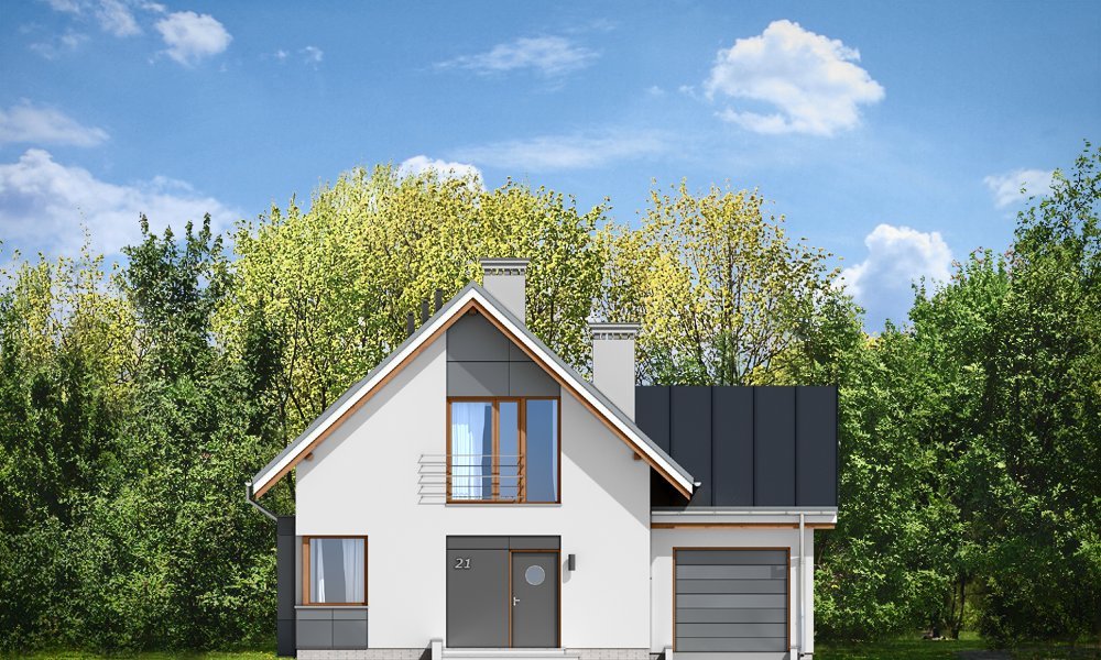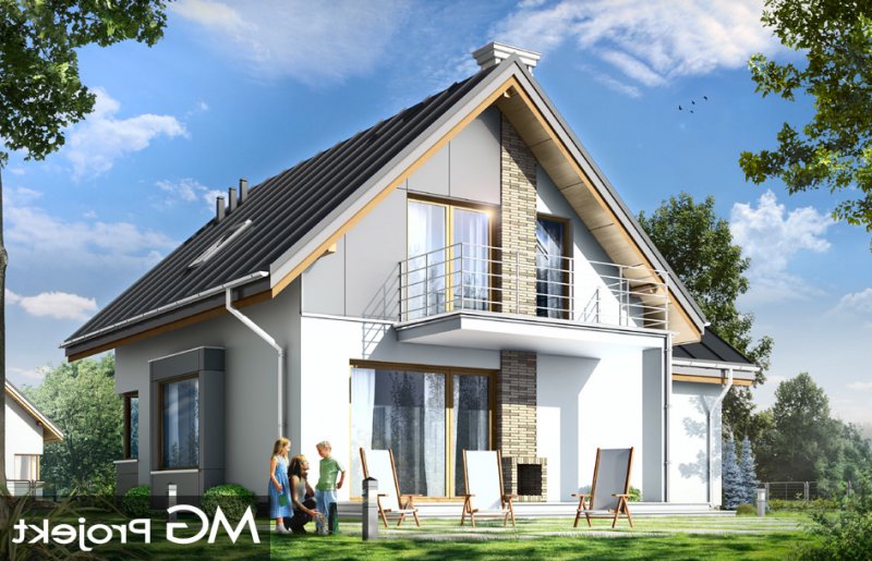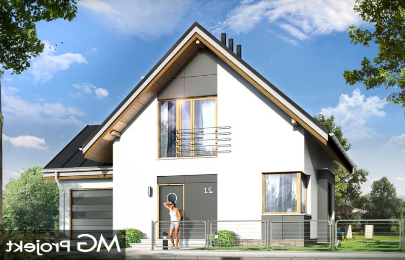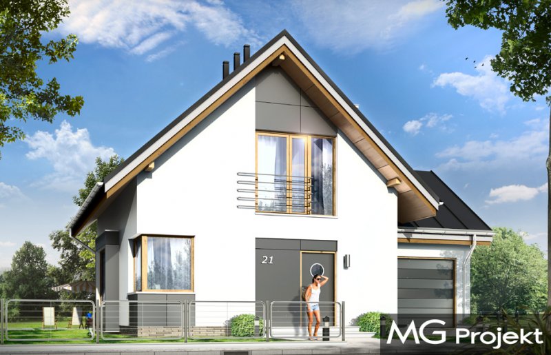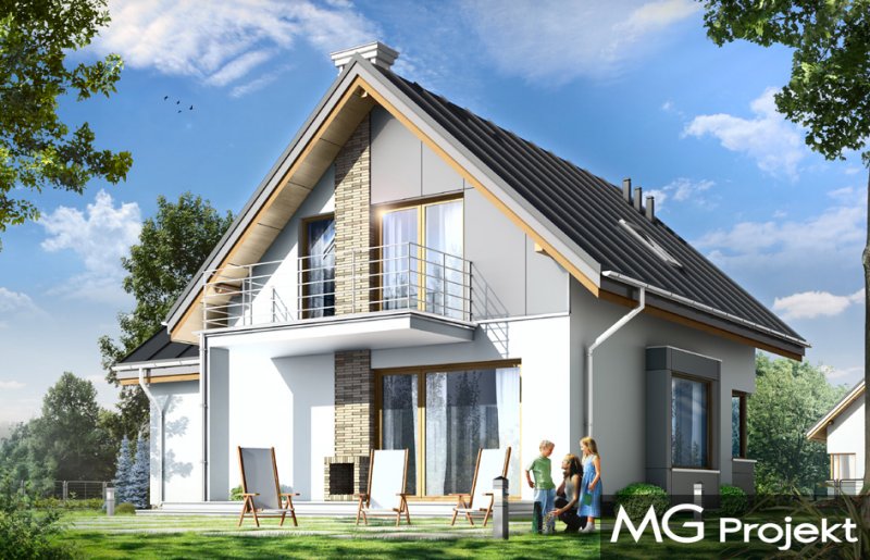 Gucio 2 to nowoczesny niewielki domek dla cztero-pięcioosobowej rodziny. Parterowy budynek przekryty dwuspadowymi dachami, z dobudowanym do głównej bryły garażem. Dom zaprojektowano, aby dać jak największy komfort przyszłym mieszkańcom, tworząc otwartą przestrzeń dzienną, charakterystyczną dla dużych domów jednorodzinnych. Salon połączony z holem, aneksem jadalnym z wykuszem, wyeksponowanymi reprezentacyjnymi schodami będzie wspaniałym miejscem do życia dla przyszłych domowników. Kominek w domu usytuowany został na ścianie zewnętrznej, co pozwoli rozkoszować się widokiem ognia i ogrodu równocześnie. Duże przeszklone drzwi łączą pokój dzienny z częściowo zadaszonym tarasem. Na parterze znajduje się też wygodna kuchnia, przedsionek, kotłownia, wc z natryskiem i garaż. Na poddaszu zaprojektowano trzy wygodne sypialnie z niewielkimi "skosami", oraz z wbudowanymi szafami - garderobami. Dodatkowo na poddaszu znajduje się ładna łazienka. Nad garażem mieści się strych gospodarczy dostępny z garażu. Architektura domu podkreśla prostotę form, nowoczesność w doborze materiałów, co wszystko razem tworzy udaną kompozycję. Dom jest łatwy w budowie i niedrogi w późniejszym utrzymaniu. Projekt dostępny jest także w wersji odbicia lustrzanego.