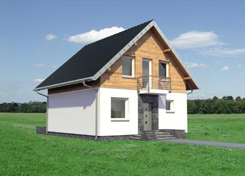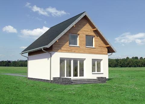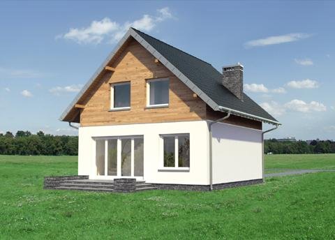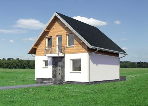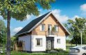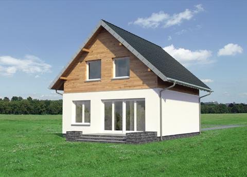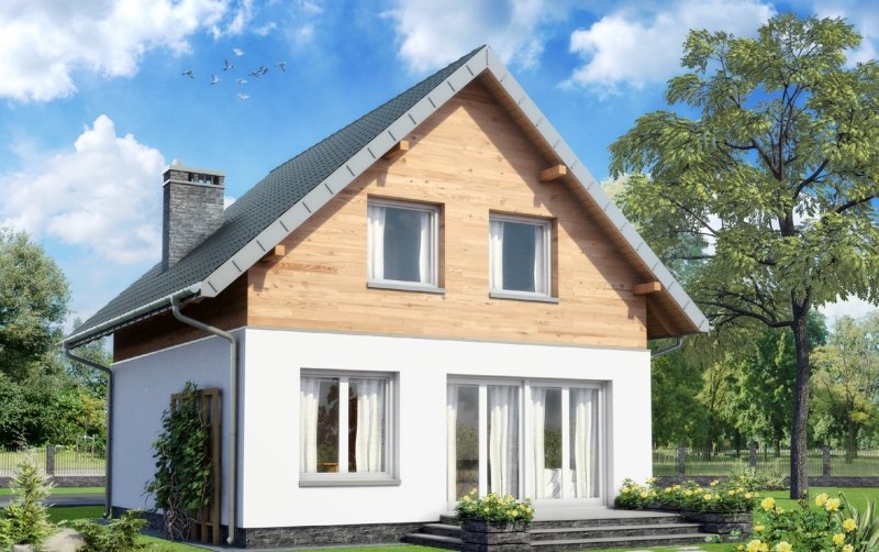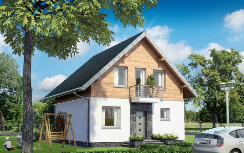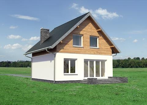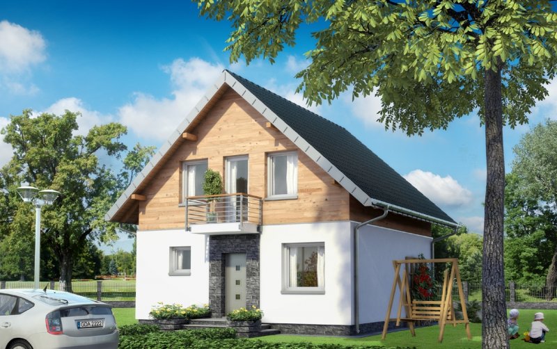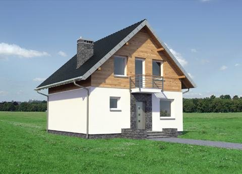 Projekt małego, energooszczędnego domu parterowego z użytkowym poddaszem ma ograniczone możliwości rozwiązań funkcjonalnych. Powierzchnia nieco ponad 90m2 i prostokątny, zwarty rzut decydują o tym, że na parterze, oprócz strefy dziennej, wc i przestrzeni komunikacji, pozostaje już niewiele miejsca. Projekt domu Gutek, należący do tej kategorii rozwiązań, proponuje, aby wykorzystać je na dodatkowy pokój przy wejściu oraz na wygodną łazienkę z kotłem gazowym. Jest to jedna z trzech podobnych koncepcji prostego, taniego budynku z dwuspadowym dachem zwróconego do wjazdu na działkę ścianą szczytową z balkonem. Pozostałe to: projekt domu Dorian z dużą kotłownią i projekt domu Gawra – z wyjątkowo dużym pokojem dziennym, z dużą kuchnią i wygodną łazienką. Projekt domu Gutek wyróżnia się wśród nich oryginalnym wnętrzem salonu ze schodami na poddasze. Brak otworów w ścianach bocznych i połaciach dachu pozwala zrealizować go na wyjątkowo wąskiej działce – tylko 14,1m! Okna w ścianach szczytowych, zwłaszcza od ogrodu są duże i kompensują doświetlenie strefy dziennej.