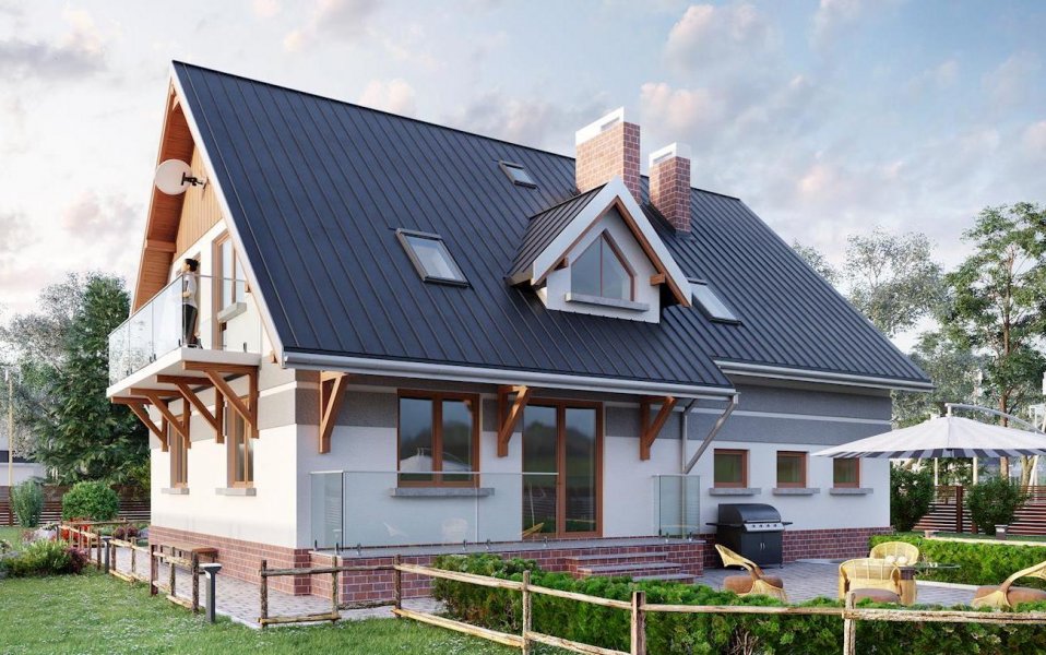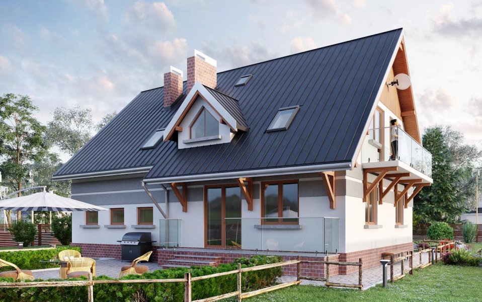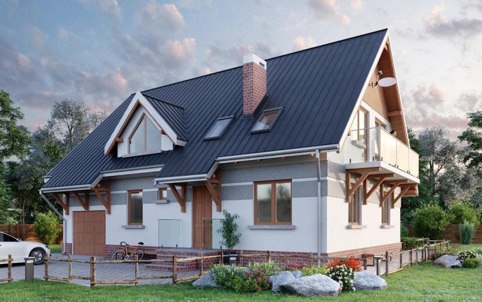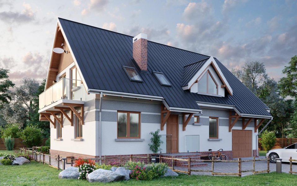 Na parterze znajduje się sień, hol, kuchnia, pokój dzienny, gabinet, w.c., kotłownia, pomieszczenie gospodarcze i garaż. Na poddaszu rozmieszczono 4 pokoje sypialne, łazienkę i garderobę. Bryłę budynku stanowi prostopadłościan nakryty dachem dwuspadowym, symetrycznym o kącie nachylenia 45°. Budynek urozmaica zadaszenie wejścia i tarasu, balkon i lukarny w dachu.
