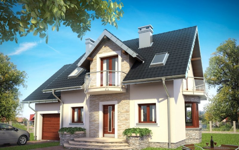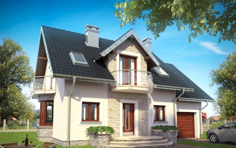 Elewacje: tynki mineralne, silikonowe, akrylowe lub mozaikowe, częściowo kamień naturalny;