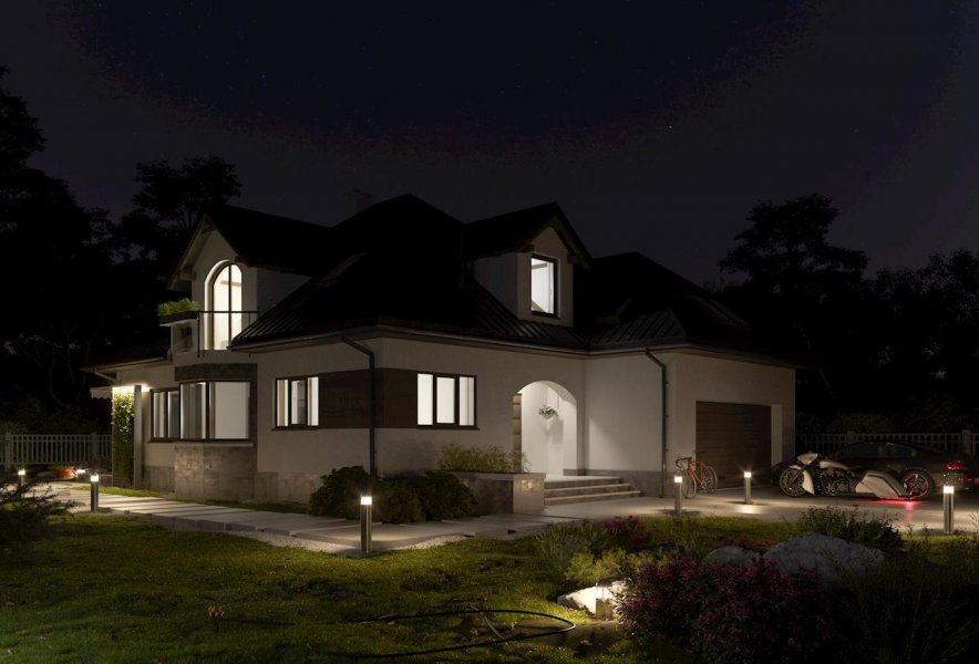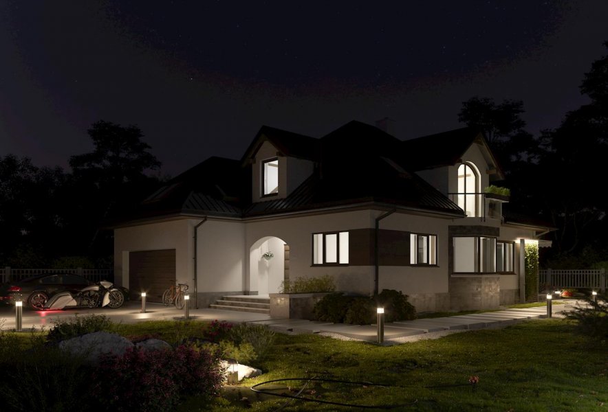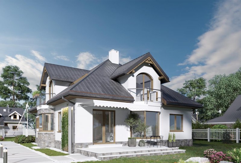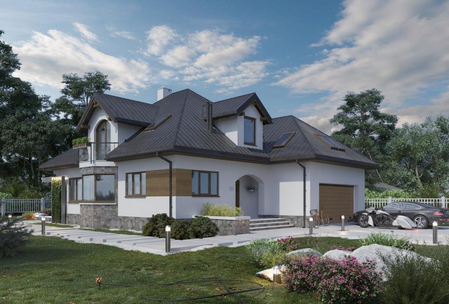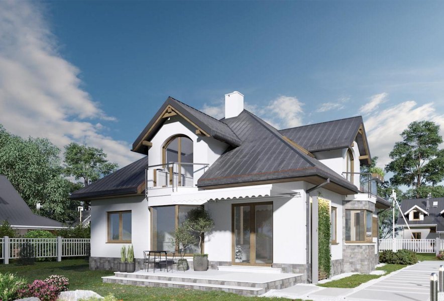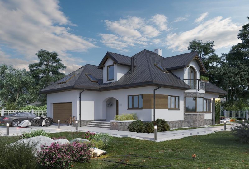 Projekt domu Honorata, jako jedyna wśród dużych propozycji z użytkowym poddaszem i podwójnym garażem Archetonu powstał na rzucie dwóch przenikających się w narożach prostokątów. Część wysunięta ku frontowi to garaż i kotłownia, a w cofniętym głębiej budynku znalazło się komfortowe mieszkanie. Rozbudowaną bryłę przykrywają czterospadowe, przenikające się dachy, a wejście frontowe we wnęce zacienia arkada. Bryła przypomina mniejsze domy z Rodziny Hortensji oraz Hermesa, które mają podobny układ funkcjonalny ale nie tak imponujące powierzchnie pomieszczeń. Na parterze Honoraty znajduje się obszerna, otwarta ale bardziej podzielona ścianami strefa pokoju dziennego, hol i kuchnia ze spiżarnią. Dodatkowy, położony na uboczu i zamknięty dodatkowym przejściem pokój ma własną łazienkę. Zasadniczy poziom poddasza wypełniają 3 obszerne pokoje z balkonami i duża łazienka. Główna, czwarta sypialnia dostępna jest z półpiętra; dysponuje osobną łazienką, garderobą i aneksem do pracy. Mimo podobieństw oraz drugiego ryzalitu z balkonem i lukarną w elewacji ogrodowej, projekt domu Honorata prezentuje alternatywny - prostszy detal niż dekoracyjna Hortensja.