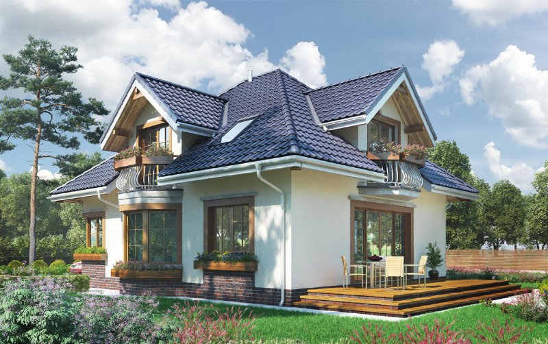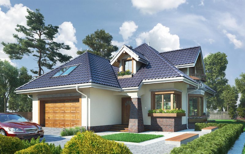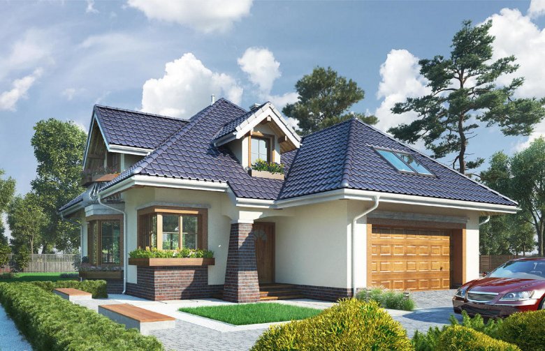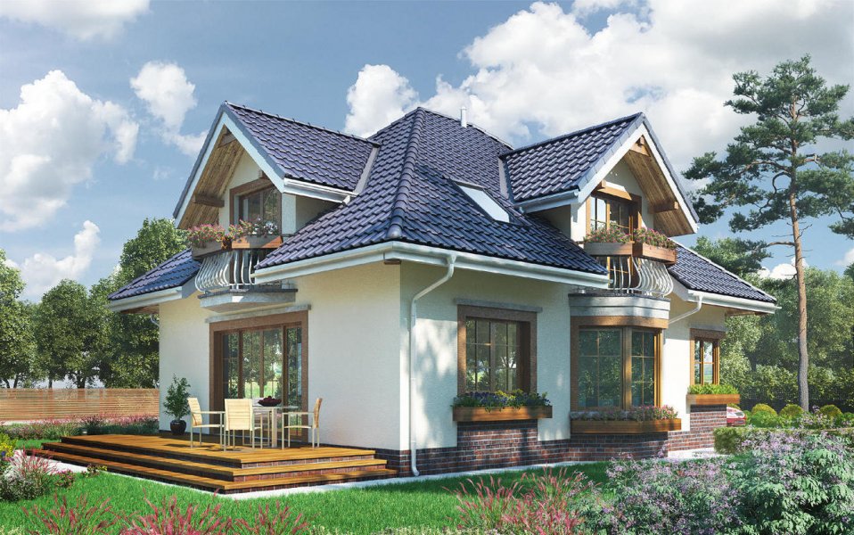 Rodzina Hortensji to średniej wielkości domy z użytkowym poddaszem o rozbudowanej sylwetce dawnej, miejskiej willi. Rzut ukształtowano z dwóch zazębiających się prostokątów: wysuniętego ku frontowi posesji - z garażem i kotłownią oraz z cofniętego w głąb ogrodu - z częścią mieszkalną. Przekrycie z czterospadowych, przenikających się dachów tworzy malowniczą strukturę wielospadową z lukarnami w każdej elewacji. Wejście akcentuje podcień ze słupem w formie przypory. W elewacji ogrodowej i bocznej dwie większe lukarny stanowią zwieńczenie fantazyjnych balkonów. W projekcie domu Hortensja Bona, z podwójnym garażem i największym pokojem dziennym, układ otwartego parteru najwyraźniej rozgranicza hol, kuchnię z jadalnią i salon. Kominek zmienił centralne położenie, a program użytkowy parteru nie przewiduje dodatkowego pokoju z łazienką, jak inne warianty. Na dwupoziomowym poddaszu rozlokowano trzy sypialnie, garderobę, pralnię na półpiętrze i dużą łazienkę – wszystkie pomieszczenia mają charakterystyczne wnętrza pod skosami. Szczególnie komfortowy w projekcie domu Hortensja Bona jest duży zespół głównej sypialni nad garażem z własną łazienką.