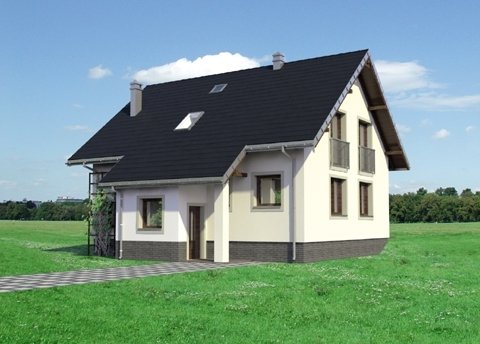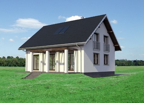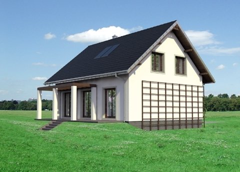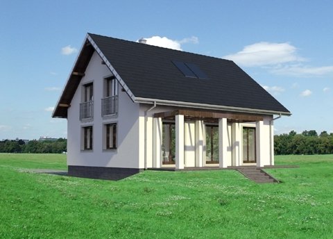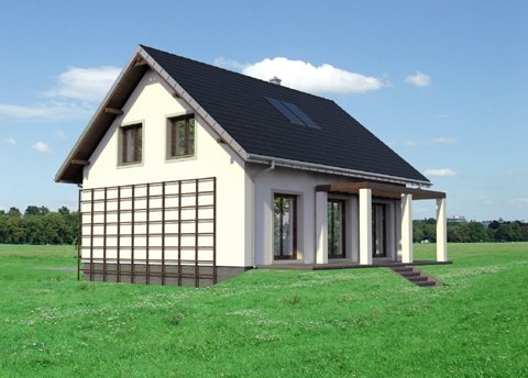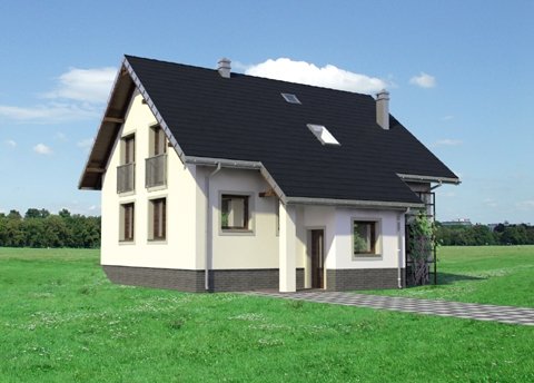 Tak jak zbliżone Brzoza czy Dzwonek, projekt domu Ibis Eko to najbardziej ekonomiczna propozycja budowy domu parterowego z użytkowym poddaszem bez garażu o powierzchni użytkowej ok.120m2. Prosty, dwuspadowy dach bez lukarn z kalenicą równoległą do drogi dojazdowej, rzut zbliżony do kwadratu i brak balkonów gwarantuje sprawną budowę energooszczędnego, wygodnego lokum dla 4-5 osobowej rodziny. Dość tradycyjny, półotwarty plan parteru dzieli na dwie połowy ściana nośna. Od frontu znajduje się strefa wejściowa z kuchnią (w której wydzielić można spiżarnię), schodami i wygodnym holem z miejscem na dwie duże szafy i łazienkę. Od ogrodu przewidziano salon i dodatkowy pokój, które można połączyć w jedno większe pomieszczenie. Strefa nocna na poddaszu to trzy duże sypialnie i przestronna łazienka. Wysunięty z elewacji wejściowej podest klatki schodowej zarysowuje jedyny akcent w sylwetce. Przedłużony okap nad ryzalitem osłania także wejście główne w podcieniu ze słupem i sień, która razem z kotłownią znajduje się poniżej głównego poziomu parteru. Dzięki temu projekt domu Ibis Eko dobrze wykorzystuje teren ze spadkiem na działce pochylonej lekko ku wjazdowi.