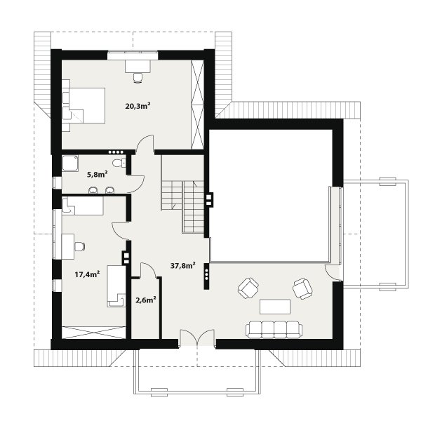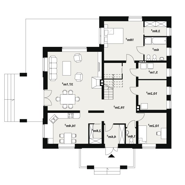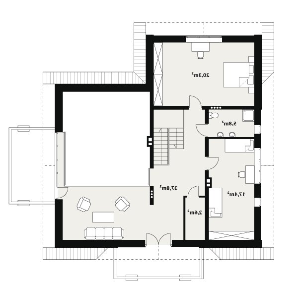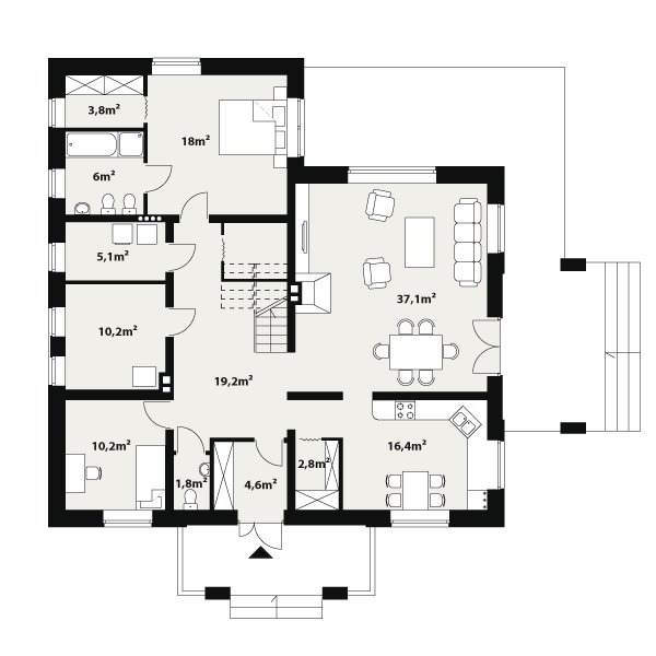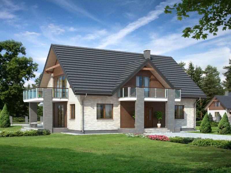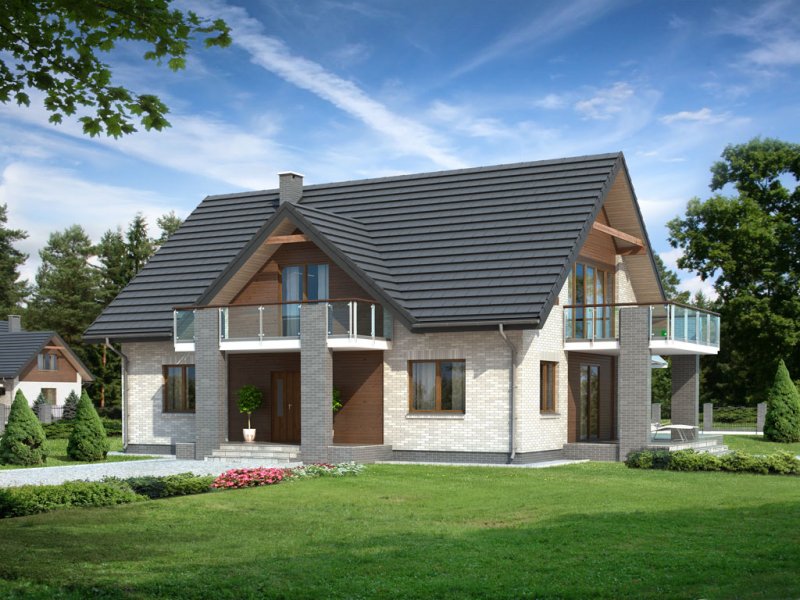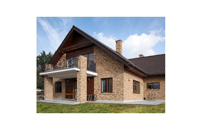Dom jednorodzinny, parterowy z poddaszem użytkowym, niepodpiwniczony, bez garażu. Reprezentacyjny dom z otwartym salonem i antresolą. Wygodny i przestronny z dużą liczbą pomieszczeń pomocniczych. Duży taras i balkony umożliwiają wypoczynek w kontakcie z naturą. Nowoczesny system ogrzewania – przewody w ścianach. Kotłownia – możliwość zastosowania każdego rodzaj opału. Instalacja elektryczna z przewidzianym agregatem prądotwórczym.