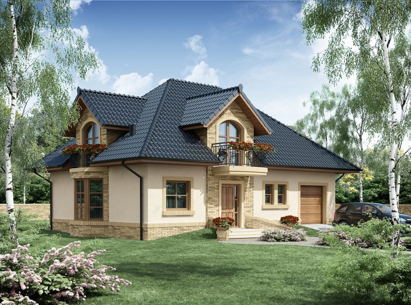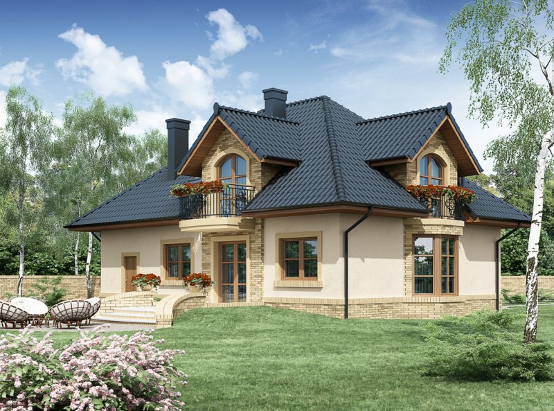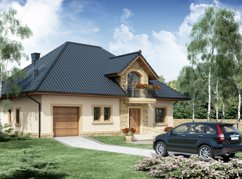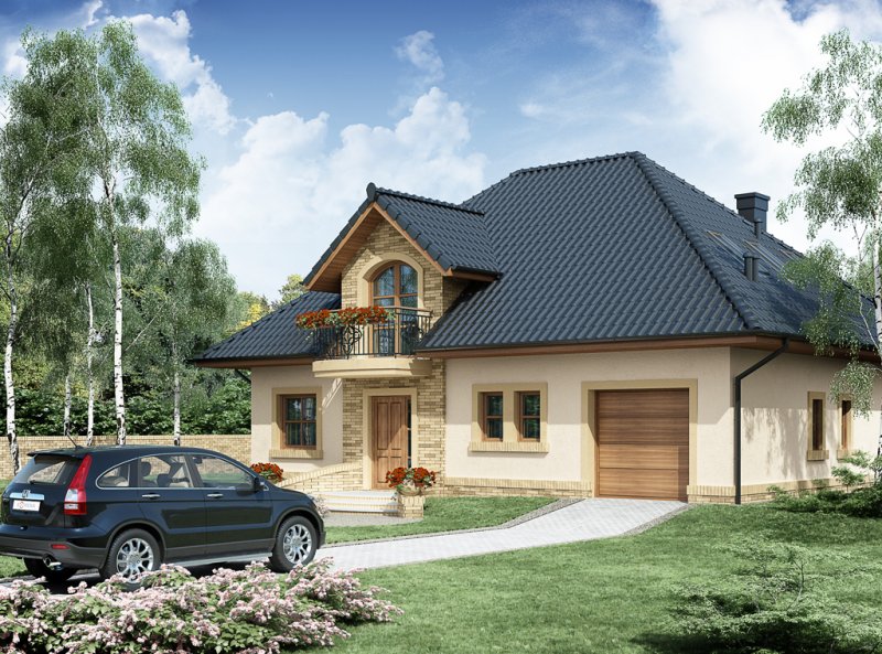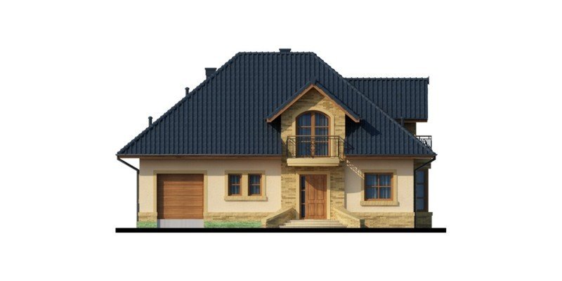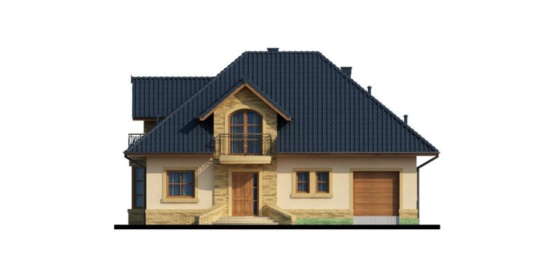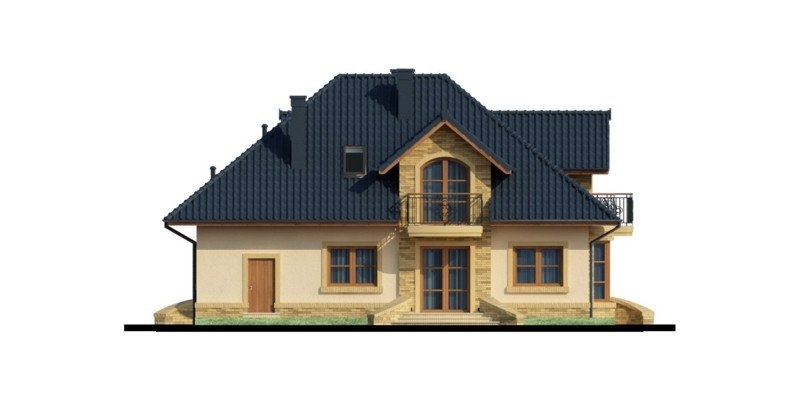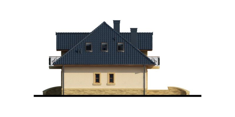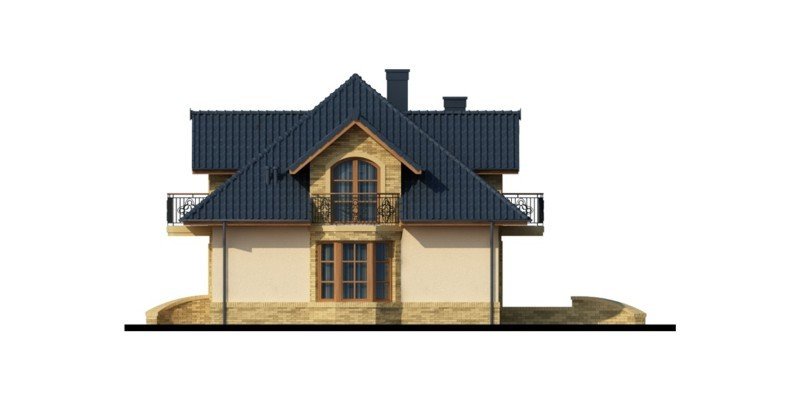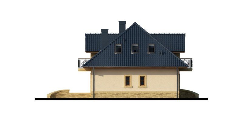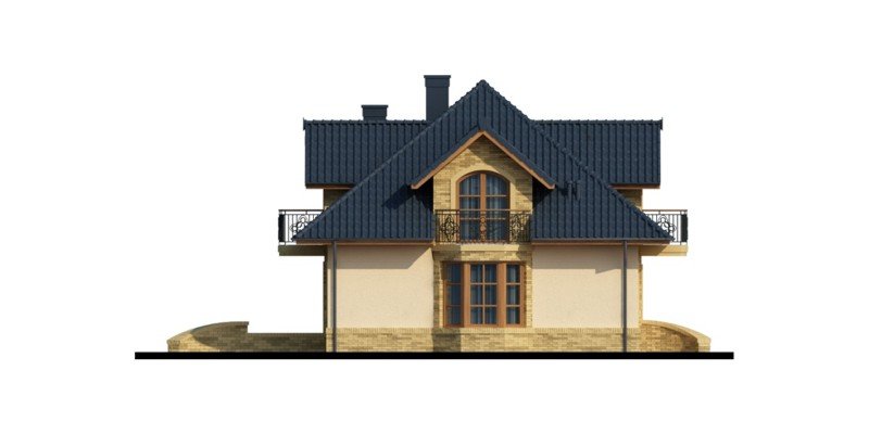 Kalamis to duży, komfortowy dom przeznaczony dla 4/5 – osobowej rodziny. Zaprojektowany został w stylistyce tradycyjnej. Po minięciu zadaszonej strefy wejściowej oraz wiatrołapu z otwartą na niego praktyczną garderobą, zarysowuje się przestronny salon oraz usytuowany na osi wejścia taras. Salon z kominkiem, jadalnia, ciekawie usytuowana w przeszklonym wykuszu i kuchnia stanowią jednorodną przestrzeń – salon płynnie przechodzi w jadalnię, która następnie łączy się z kuchnią. Kuchnia z dostępem do spiżarni może za pomocą ścianki działowej być przekształcona w zamkniętą. Cała strefa wejściowa, w zależności od upodobań, może ulec transformacjom. Można powiększyć wiatrołap kosztem spiżarni bądź garderoby, rozbudować kuchnię likwidując spiżarnię, natomiast z garderoby stworzyć dostępne od strony wiatrołapu bądź korytarza np. pomieszczenie gospodarcze. Na parterze mieści się również dodatkowy pokój, mogący pełnić także funkcję gabinetu czy pokoju gościnnego, oraz położona naprzeciwko niego łazienka. Całość strefy nocnej usytuowana jest na poddaszu. Składa się z trzech pokoi, przy czym każdy z nich posiada balkon, dwa zaopatrzone są w indywidualne garderoby, jeden natomiast dodatkowo w prywatną łazienkę. Poddasze, dzięki zastosowaniu lekkich ścianek działowych można przekształcać praktycznie w dowolny sposób –powiększać lub zmieniać kształt pokoi likwidując garderoby czy przesuwając ścianki działowe.