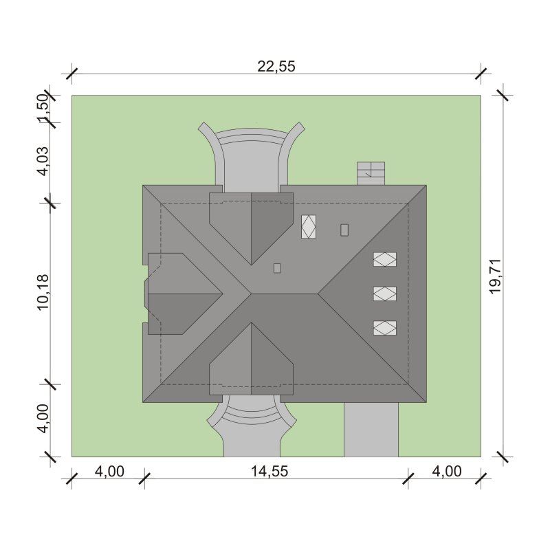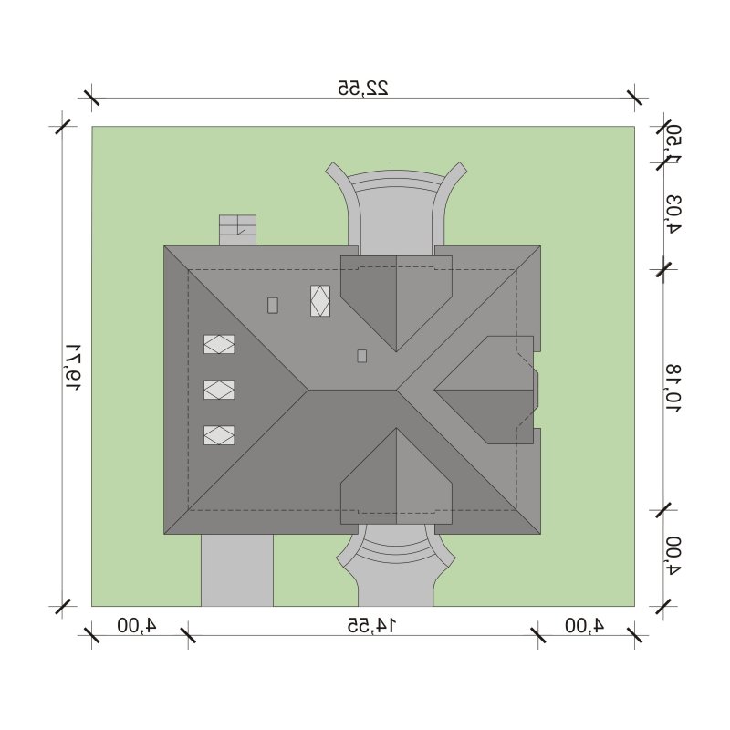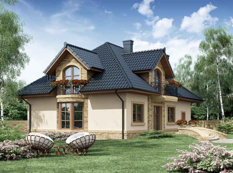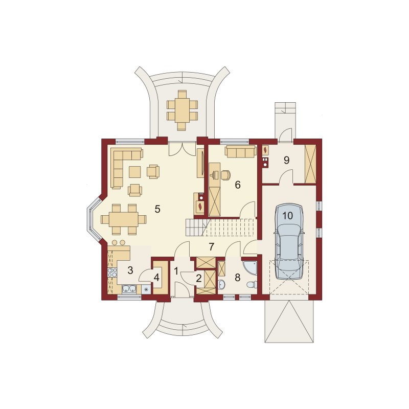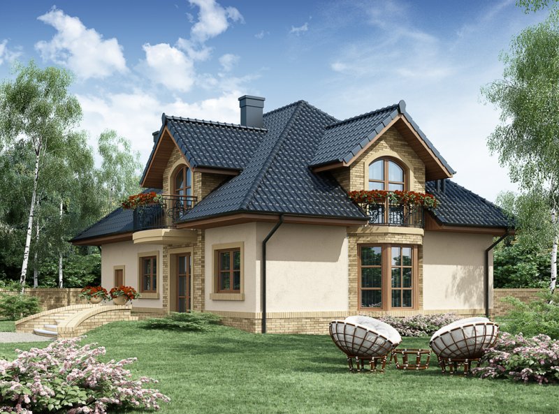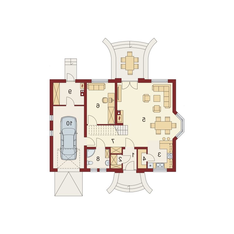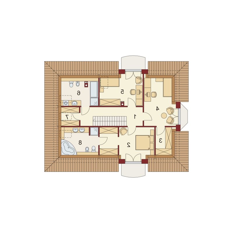 Kalamis to duży, komfortowy dom przeznaczony dla 4/5 – osobowej rodziny. Zaprojektowany został w stylistyce tradycyjnej. Po minięciu zadaszonej strefy wejściowej oraz wiatrołapu z otwartą na niego praktyczną garderobą, zarysowuje się przestronny salon oraz usytuowany na osi wejścia taras. Salon z kominkiem, jadalnia, ciekawie usytuowana w przeszklonym wykuszu i kuchnia stanowią jednorodną przestrzeń – salon płynnie przechodzi w jadalnię, która następnie łączy się z kuchnią. Kuchnia z dostępem do spiżarni może za pomocą ścianki działowej być przekształcona w zamkniętą. Cała strefa wejściowa, w zależności od upodobań, może ulec transformacjom. Można powiększyć wiatrołap kosztem spiżarni bądź garderoby, rozbudować kuchnię likwidując spiżarnię, natomiast z garderoby stworzyć dostępne od strony wiatrołapu bądź korytarza np. pomieszczenie gospodarcze. Na parterze mieści się również dodatkowy pokój, mogący pełnić także funkcję gabinetu czy pokoju gościnnego, oraz położona naprzeciwko niego łazienka. Całość strefy nocnej usytuowana jest na poddaszu. Składa się z trzech pokoi, przy czym każdy z nich posiada balkon, dwa zaopatrzone są w indywidualne garderoby, jeden natomiast dodatkowo w prywatną łazienkę. Poddasze, dzięki zastosowaniu lekkich ścianek działowych można przekształcać praktycznie w dowolny sposób –powiększać lub zmieniać kształt pokoi likwidując garderoby czy przesuwając ścianki działowe.