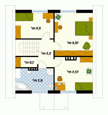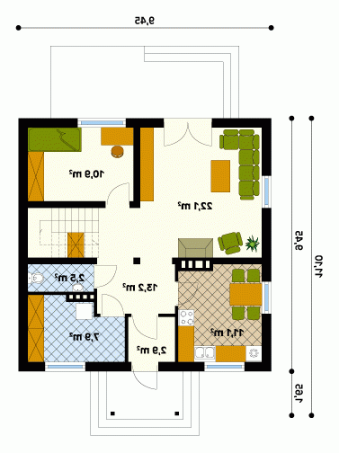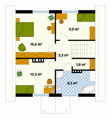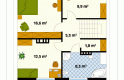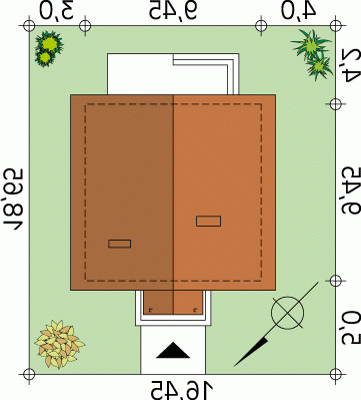 Dom jednorodzinny, parterowy z użytkowym poddaszem, niepodpiwniczony. Zaprojektowany został na rzucie kwadratu, co pozwoliło efektywnie wykorzystać powierzchnię. Dom prosty w budowie i tani w eksploatacji.