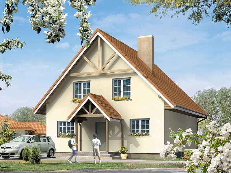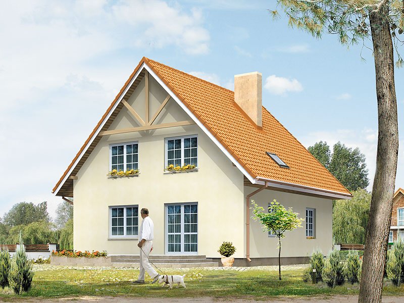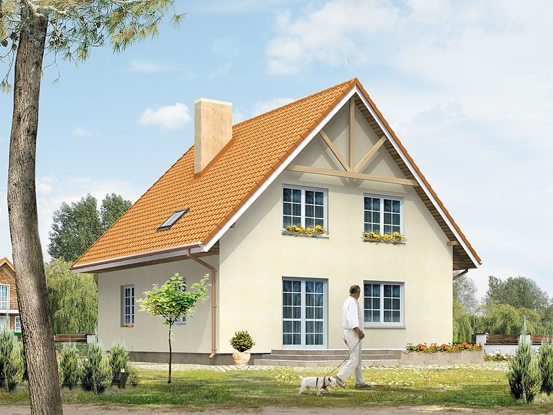 Ściany: 2-warstwowe - pustak ceramiczny + styropian, Stropy: żelbetowe, wylewane, Dach: dachówka, kąt nachylenia 45°