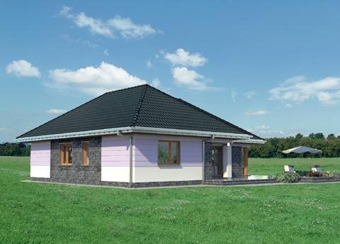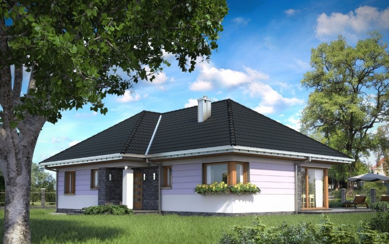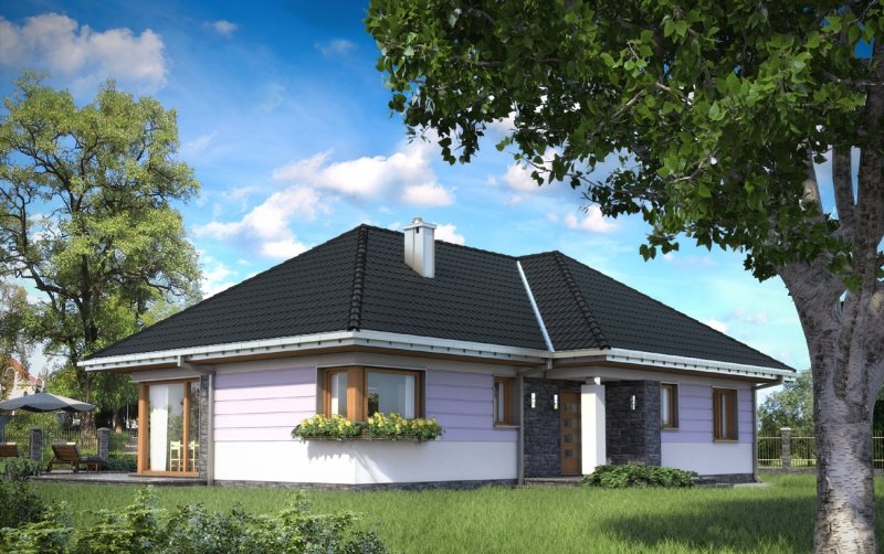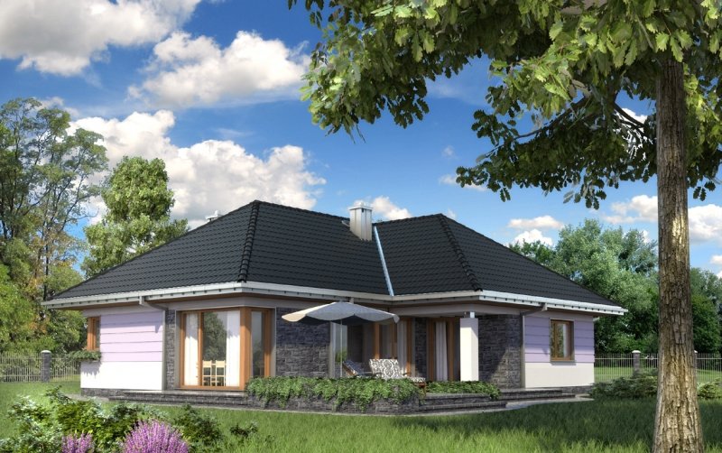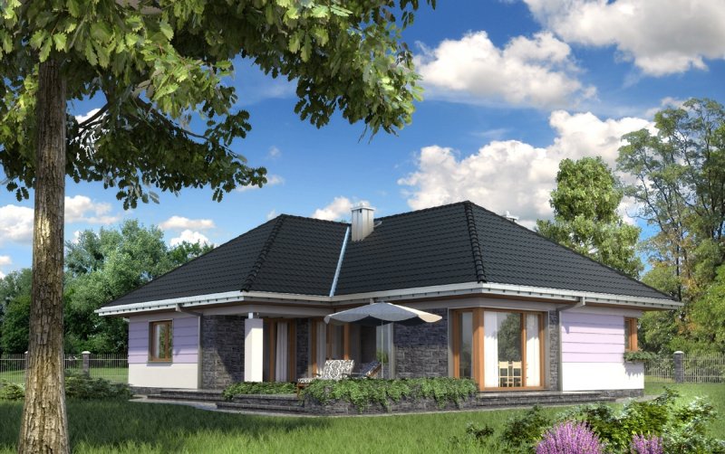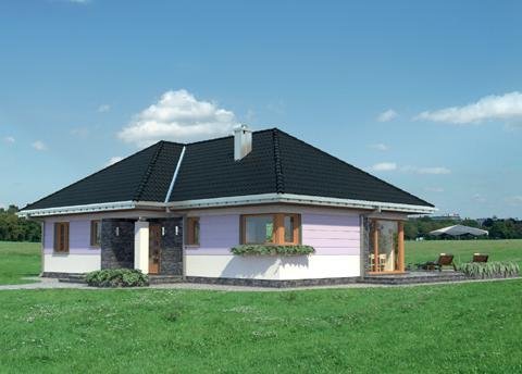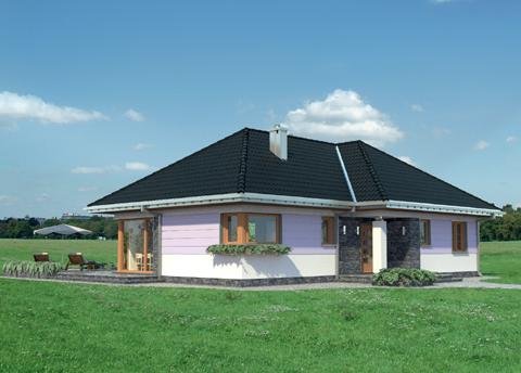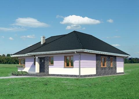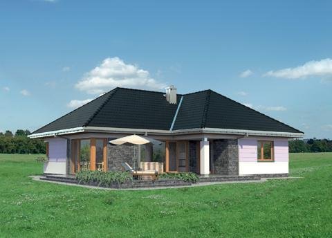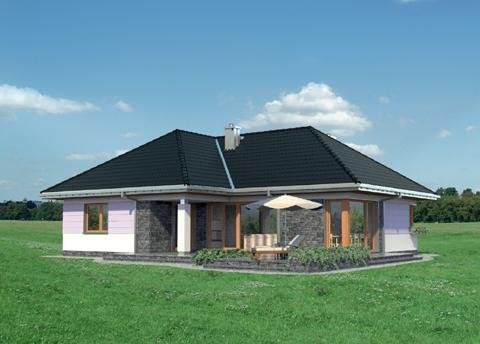 Wejście do budynku z podcienia wejściowego przez sień do hlolu. Na wprost znajduje się wejście do pokoju dziennego, a dalej przejście na zadaszony taras. Z holu ponadto dostępne są: kuchnia z jadalnią, łazienka, pomieszczenie gospodarcze oraz druga część budynku. Zlokalizowano tam: 3 pokoje sypialne, łazienkę i pomieszczenie gospodarcze. Inwestor, którego interesuje dom parterowy z nieużytkowym poddaszem, o powierzchni ok.120m2, bez garażu, znajdzie w naszej ofercie, różnorodne propozycje (np. Aleksandria, Mela). Jeśli warunki zabudowy zalecają przy tym rozwiązanie z dachem czterospadowym lub wielospadowym, to idealny będzie projekt domu Kalina. Przeznaczony dla 4 osób, na planie w kształcie litery T zamyka w jednym skrzydle część dzienną, a w drugim strefę prywatną z trzema pokojami i z dwoma łazienkami. Układ ten buduje podcienia: wejściowy i ogrodowy nad atrialnym tarasem. Pokój dzienny z kominkiem to aż 35m2 i jasna przestrzeń zwrócona dużymi przeszkleniami na ogród. Połączona z nim otwarta kuchnia tworzy ze spiżarnią i kotłownią gospodarczy zespół przy wejściu. Sypialnie są przestronne, zwłaszcza główna - z własną łazienką i z garderobą. Projekt domu Kalina wyróżnia stosunkowo stromy dach (umożliwia to adaptację do celów użytkowych). W elewacjach zaproponowano duże okna bez podziałów, w salonie i w kuchni szczególnie efektowne – narożne. Tę nowoczesną stylizację uzupełnia innowacyjne połączenie klasycznego boniowania i płaszczyzn z okładziny kamiennej.