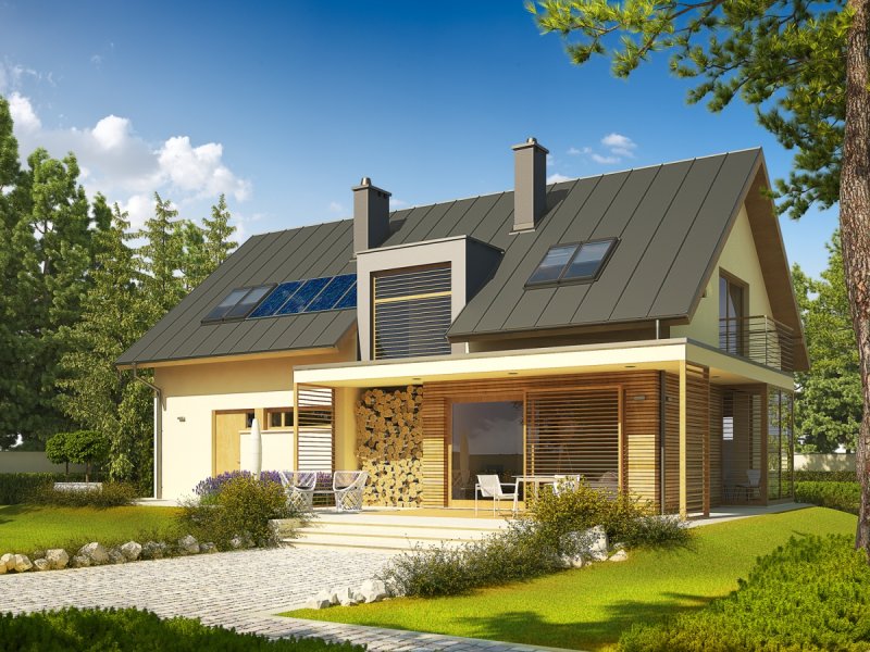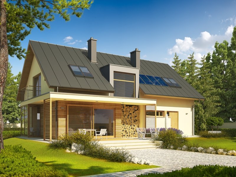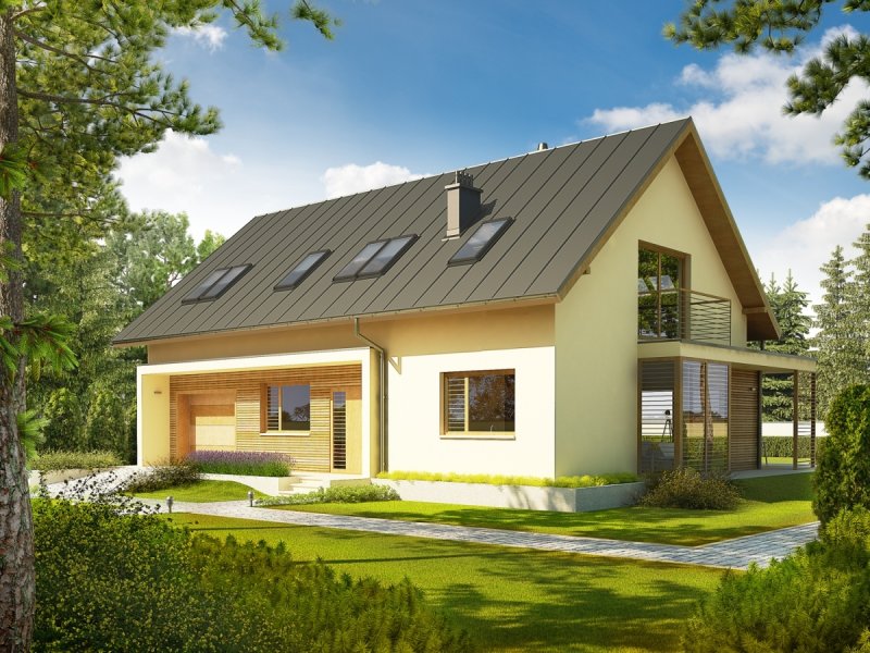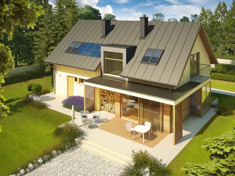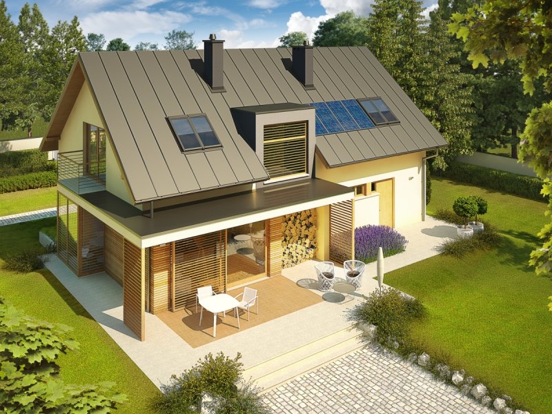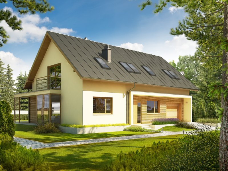 Dom zaprojektowany w technologii murowej ze stropem gęstożebrowym. Schody wewnętrzne drewniane. Dach o konstrukcji drewnianej pokryty blachą na rąbek stojący Classic firmy Ruukki. Elewacje wykończono tynkiem mineralnym w kolorze TO-YE025 z palety firmy Termo Organika i okładziną drewnianą. Cokół kamienny. Stolarka okienna drewniana lub PCV.