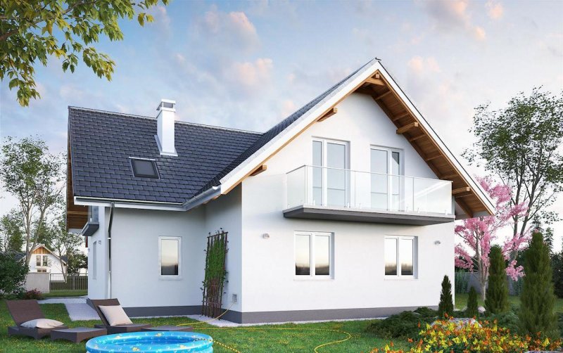Wejście przez sień do holu. Z holu - na lewo - pokój dzienny, na prawo - kuchnia, jadalnia i łazienka, na wprost - wejście do dwóch pokoi sypialnych. Na poddaszu zlokalizowano 4 pokoje sypialne, w.c., łazienkę i 2 garderoby. Dom na rzucie litery "T" nakryty dwuspadowymi dachami o kącie nachylenia połaci 40°. Lukarna i podcień wejściowy urozmaicają bryłę budynku od frontu.