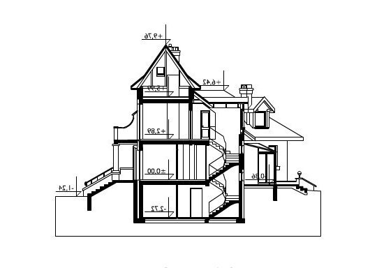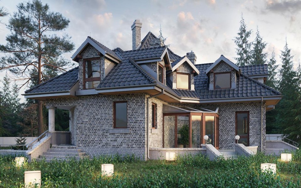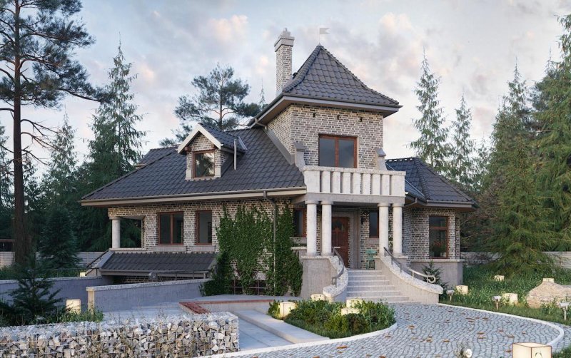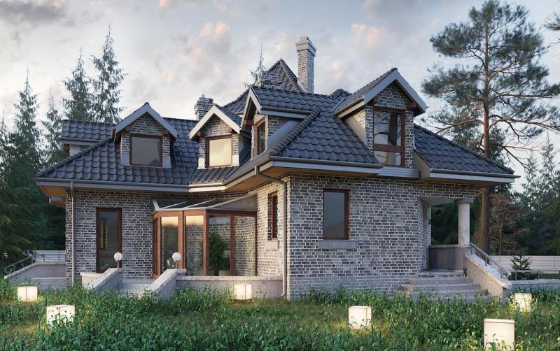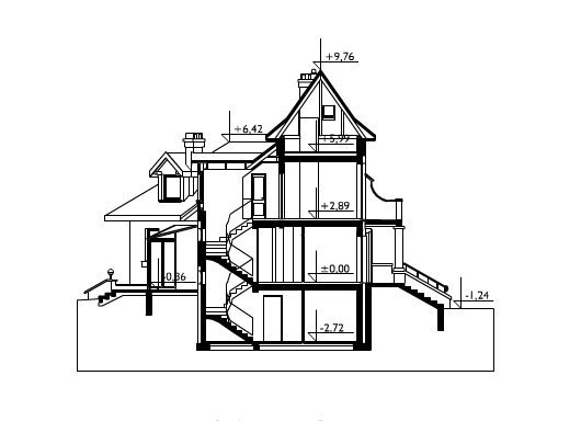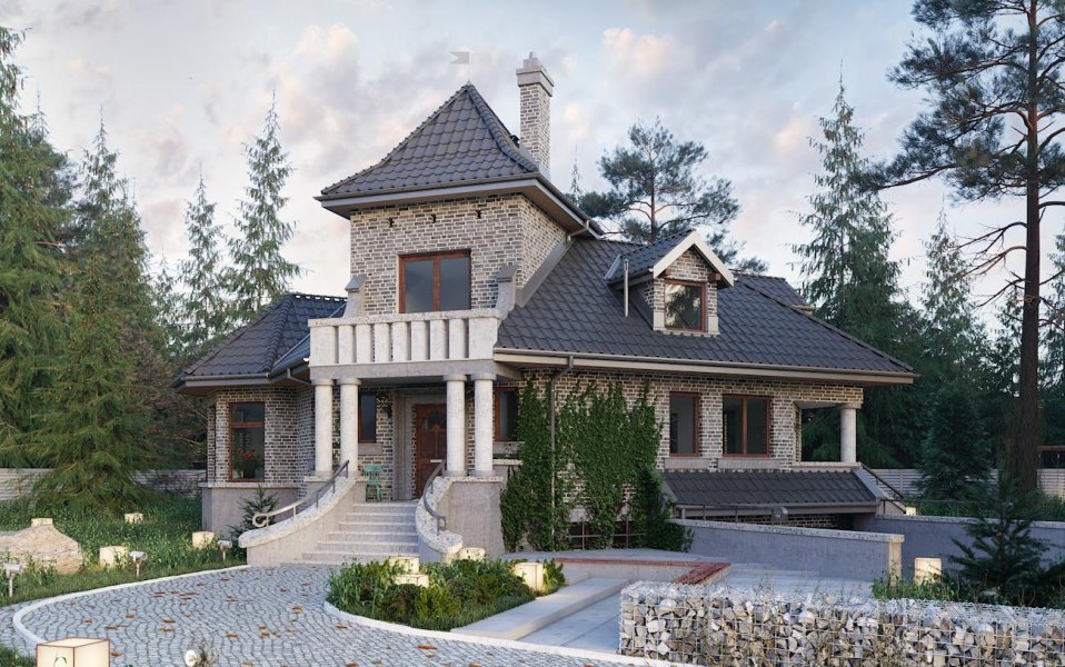 Wolno stojący dom jednorodzinny przeznaczony dla 4-6 osób. Na parterze zlokalizowano: pokój dzienny z jadalnią i kominkiem oraz przyległym do niego ogrodem zimowym, kuchnię, pokój dla dwóch osób oraz przynależną do niego garderobę i łazienkę, w.c., hol z klatką schodową oraz sień. Poddasze obejmuje dwa pokoje jednoosobowe, pokój dwuosobowy, łazienkę, przedpokój oraz niewielki schowek. W piwnicy przewidziano: garaż dla dwóch samochodów, dwa pomieszczenia gospodarcze, spiżarkę oraz korytarze. Dom na planie litery "L" z wyraźnie wyodrębnionymi z bryły piętrową wieżą oraz niewielkim ryzalitem mieszczącym jadalnię. Od strony ogrodu do budynku przylega ogród zimowy. Wejście z podcienia. Dach wielospadowy, o kątach nachylenia połaci 40°, z licznymi lukarnami. Dach wieży ma spadek 55°.