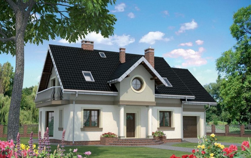 W Rodzinie Klary zaprojektowano kilka małych i średnich, głównie tradycyjnych w stylu, parterowych domów z użytkowym poddaszem oferujących dużą ilość pomieszczeń. Projekt domu Klara Rex Mobil jest największym z nich, jednym z kilku z dobudowanym garażem. Część mieszkalna na wzbogaconym dwoma ryzalitami, prostokątnym rzucie, przekryta została osobnym dachem i zachowuje też inne, wspólne cechy rodziny. Są nimi: oddzielenie pokoju dziennego od kuchni podłużną ściana nośną, dodatkowy pokój przy salonie oraz garderoba i spiżarnia przy sieni. Miejsce pod schodami włączono do kotłowni stanowiącej połączenie z garażem. Tylko w projekcie domu Klara Rex Mobil wykorzystano poddasze nad obiema częściami budynku. Dzięki temu powstało najwięcej, bo aż pięć pokoi z wygodną łazienką. Oszczędne gospodarowanie miejscem wynagradza w rodzinie Klary (oprócz innego - nowoczesnego wariantu Polo) malownicza bryła. Urozmaicają ją balkony i oktagonalny ryzalit z jadalnią w ścianie bocznej. Lukarny, umieszczone symetrycznie w elewacji frontowej i ogrodowej, akcentują wejściowy podcień na słupach niosących łazienkę oraz główną sypialnię po drugiej stronie kalenicy.