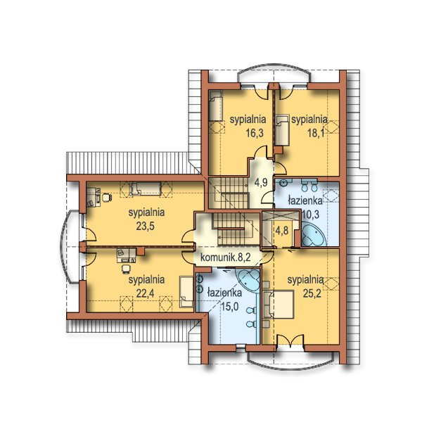 Większa część z wejściem od frontu składa się na parterze z wygodnego salonu z jadalnią, dużej kuchni, hallu, wc, kotłowni oraz garażu z pomieszczeniem gospodarczym i kotłowni. Mniejsza część seniorów składa się z pokoju dziennego, kuchni z jadalnią, hallu oraz łazienki. Kotłownia jest dostępna również z tej części domu. Na poddaszu znajdują się: w części większej trzy bardzo duże sypialnie w tym jedna z garderobą, hall i łazienka; w części mniejszej: dwie duże sypialnie i łazienka połączone korytarzem. Istnieje możliwość innego podziału funkcjonalnego parteru i poddasza, wydzielenie garderoby, jak i połączenie obu części.