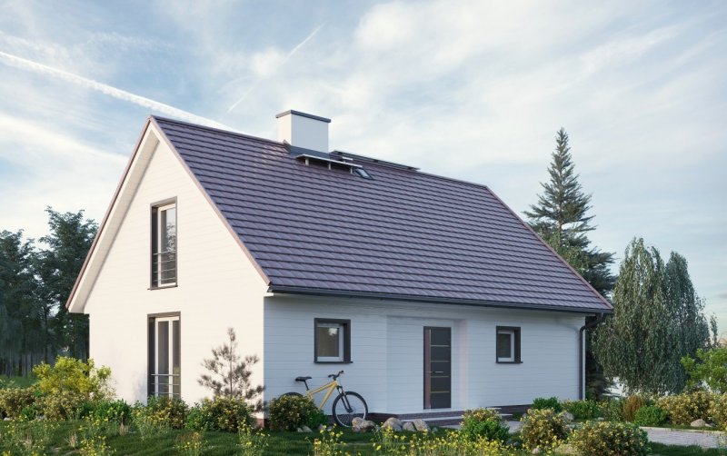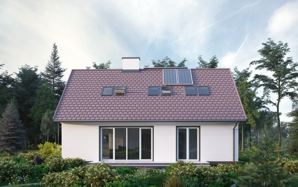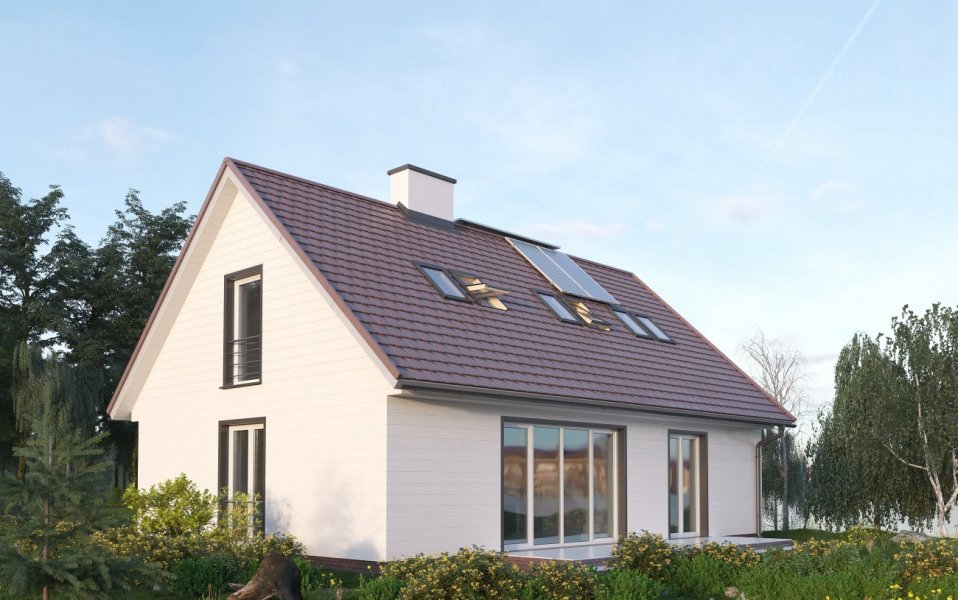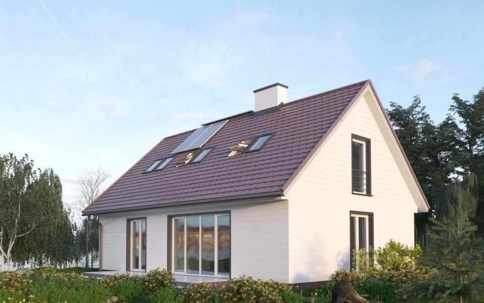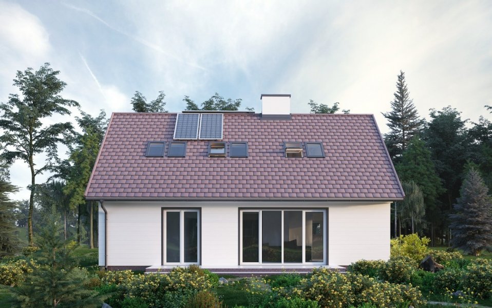 Wygodny parterowy dom z użytkowym poddaszem dla rodziny z trójką dzieci i z pokojem dla seniora lub gabinetem. Wyższą od standardowej ciepłochronność ścian zewnętrznych osiągnięto w tym projekcie układając na murze z bloków wapienno-piaskowych Silka wełnę mineralną grubości aż 20cm. Pomieszczenia doświetlają okna o energooszczędn ych przeszkleniach i profilach. Projektant ograniczony koniecznością zachowania zwartej bryły skoncentrował działania plastyczne na zdyscyplinowanym rysunku elewacji. Największe przeszklenia przewidział w słonecznej elewacji ogrodowej - pionowy układ otworów akcentuje tu rytm zdwojonych okien dachowych. W projekcie architektury zaproponowano miejsce montażu kolektorów słonecznych Viessmann. Po wykonaniu projektu ich instalacji (dostosowanego do warunków nasłonecznienia w konkretnej lokalizacji) będą one mogły współpracować z instalacją centralnej wody użytkowej. O zapewnieniu komfortu cieplnego w pomieszczeniach i niskich nakładach na ogrzewanie decyduje również wentylacja mechaniczna i niskotemperaturowe ogrzewanie współpracujące z gazowym kotłem kondensacyjnym o najwyższych parametrach sprawności. Prosta architektura sprawia, że budynek łatwo wpisuje się w każdy krajobraz, a rozwiązania materiałowe i instalacyjne sprzyjają naturze.
