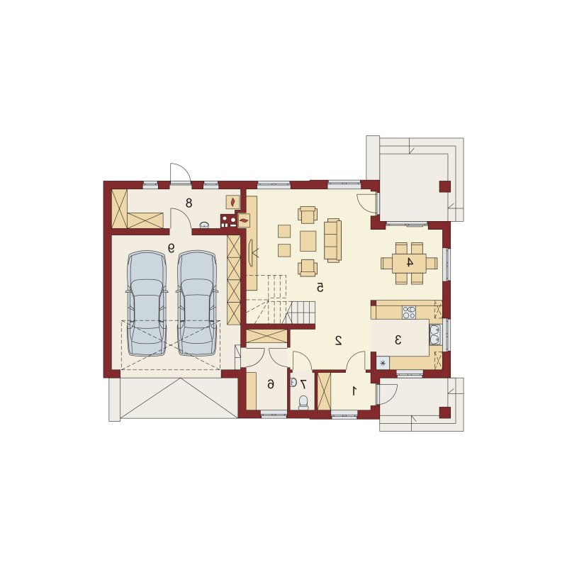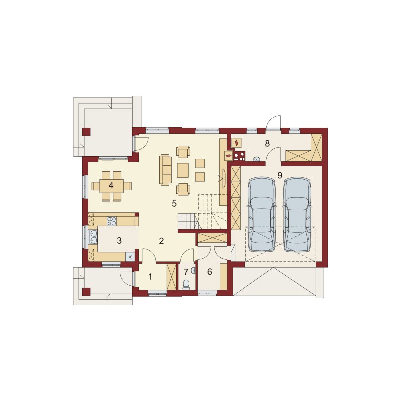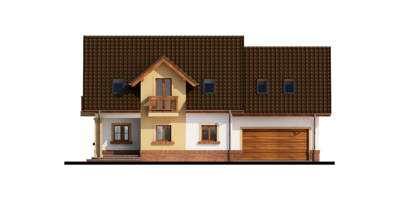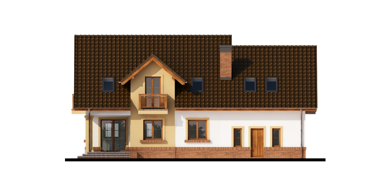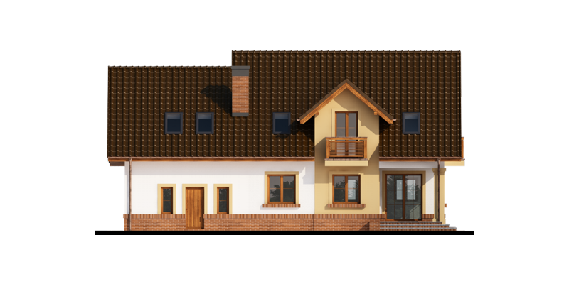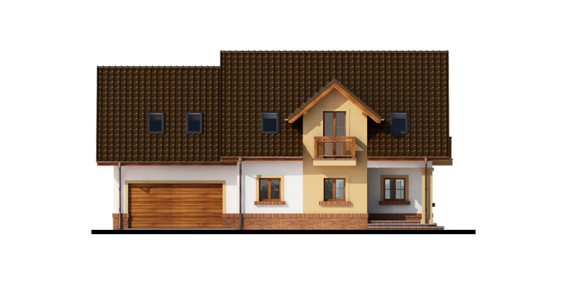 Obok wiatrołapu zlokalizowano wc oraz pomieszczenie gospodarcze, które można przeznaczyć na spiżarnię. Bezpośrednio z pomieszczenia gospodarczego dostaniemy się do dwustanowiskowego garażu oraz kolejnego pomieszczenia/kotłowni, gdzie zaprojektowano dodatkowe wyjście od strony ogrodu.