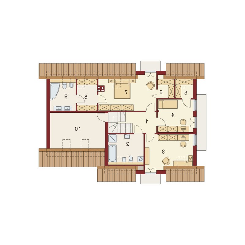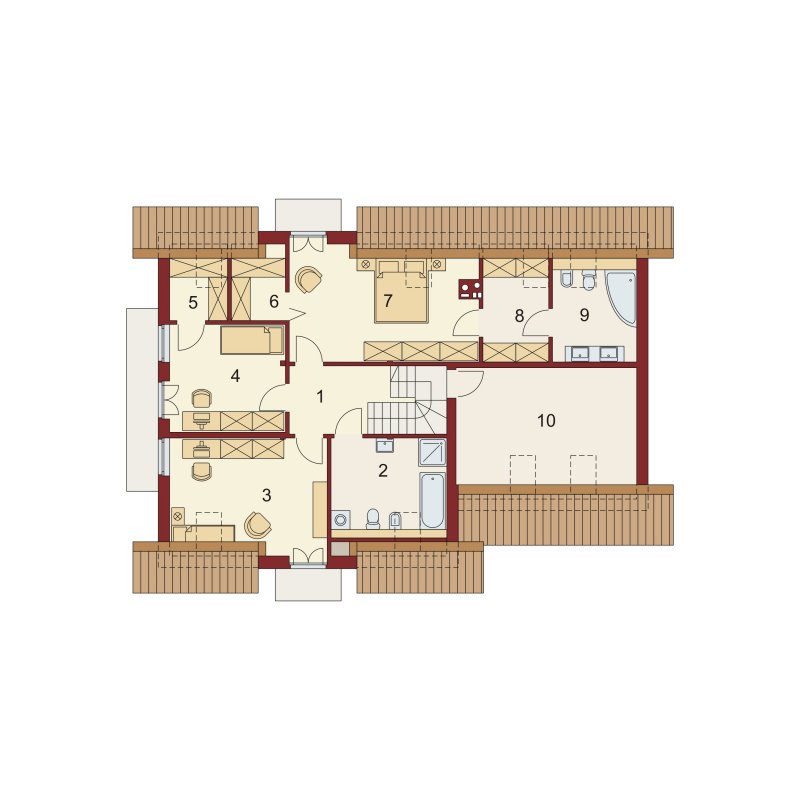 Na poddaszu znajdują się trzy ustawne sypialnie, oraz ogólnodostępna łazienka. Każdy pokój posiada wyjście na balkon, dwa z nich zaprojektowano wraz z dodatkową garderobą. Największy z pokoi wyposażono także w odrębną łazienkę.