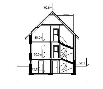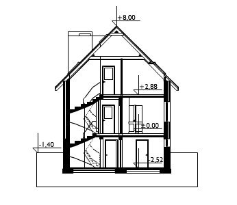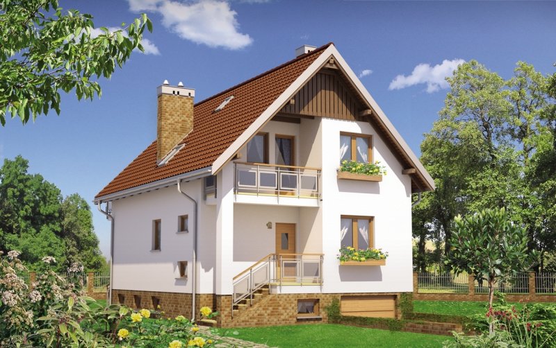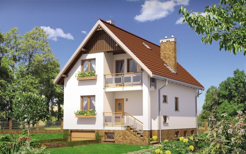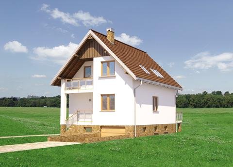 Projekt domu Koral to jeden z nielicznych projektów małych domów z użytkowym poddaszem przeznaczonych na wąską działkę, który oferuje całkowite podpiwniczenie. Jest o kilkanaście m2 mniejszy od Korala Rex przewidującego identyczny program użytkowy na nieco dłuższym planie. Front obu propozycji zwrócono szczytem dwuspadowego dachu w kierunku wjazdu na parcelę. Rozwiązanie to wyróżnia wnęka z narożnym słupem niosącym balkon sypialni poddasza, który osłania wejście. Wysoki parter zajmuje tradycyjnie zagospodarowana wydzielonymi pomieszczeniami część dzienna mieszkania: pokój dzienny, duża kuchnia i łazienka oraz hol i schody. Na poddaszu zmieszczą się trzy sypialnie z łazienką, a w piwnicy, oprócz jednostanowiskowego garażu, kotłownia i kilka pomieszczeń gospodarczych. Tradycyjny i ekonomiczny jest też sposób oświetlenia poddasza – bez lukarn, głównie dużymi oknami w ścianach szczytowych. Oprócz zagłębienia pod okapem akcentującego wejściowe schody, jedynym urozmaiceniem ekonomicznej bryły jest w projekcie domu Koral długi balkon. Doskonale osłania i zacienia wyjście z salonu na duży taras ogrodowy.