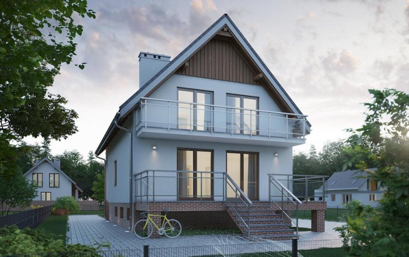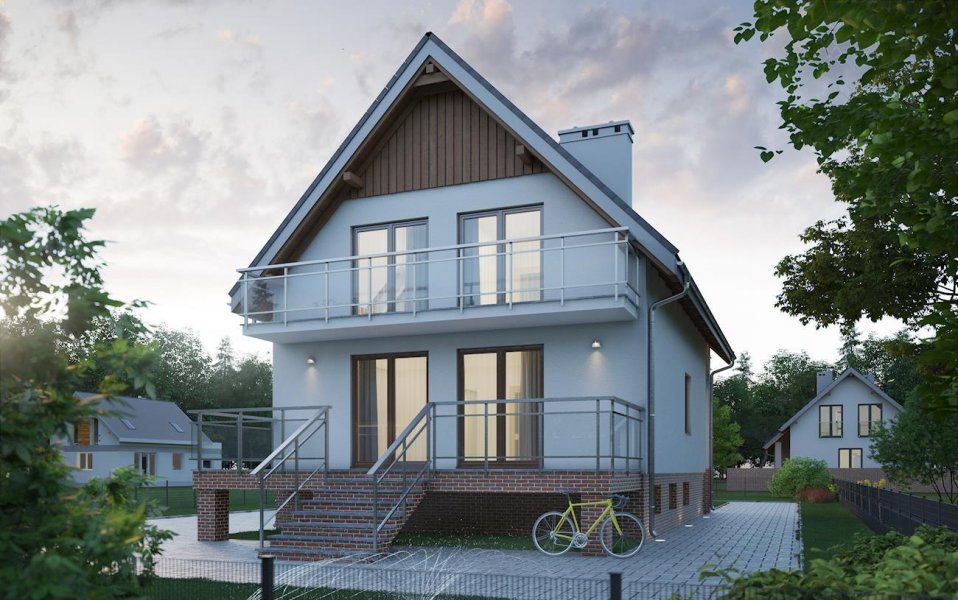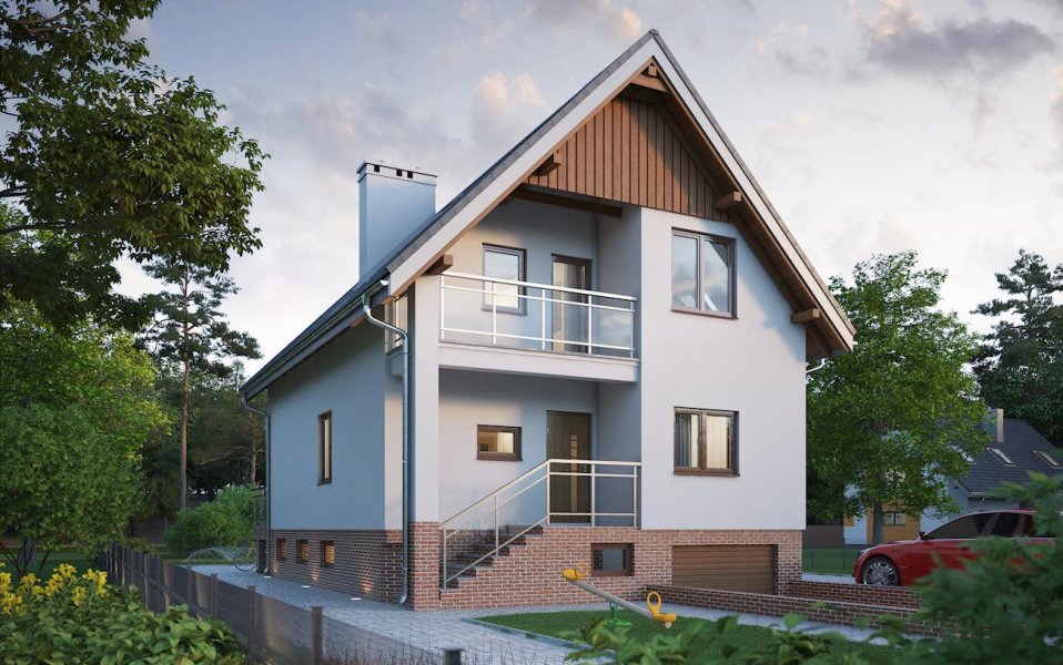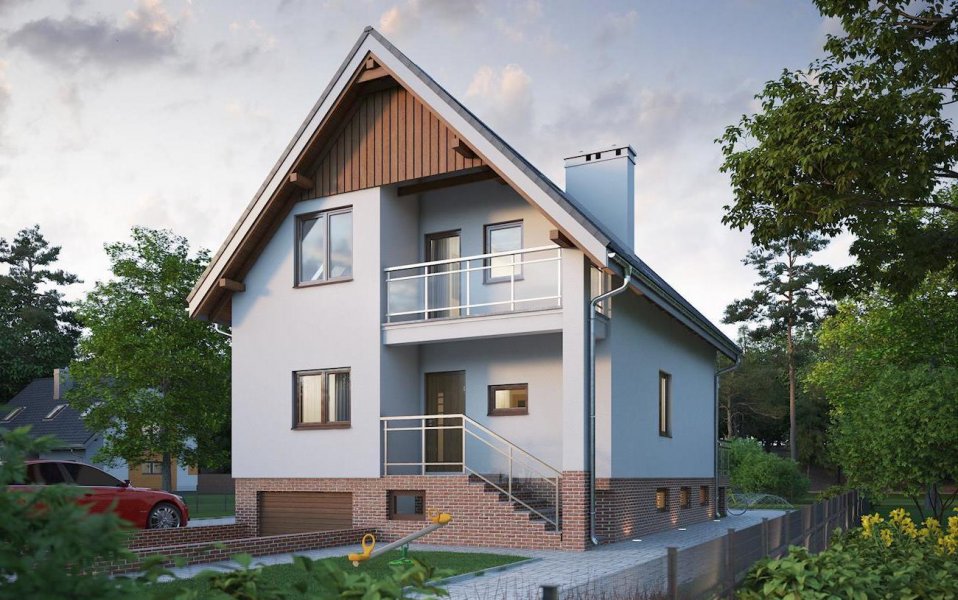 Projekt Koral Rex to jeden z nielicznych projektów niewielkich domów z użytkowym poddaszem przeznaczonych na wąską parcelę, który przewiduje pełne podpiwniczenie. Razem z nieco mniejszą Biedronką prezentuje przy tym zwartą bryłę z dwuspadowym dachem, zwróconą do wjazdu na działkę szczytem. Front Korala wyróżnia wnęka z narożnym słupem niosącym balkon osłaniający wejście główne. Parter zajmuje tradycyjnie zagospodarowana wydzielonymi pomieszczeniami część dzienna mieszkania: pokój dzienny, duża kuchnia i łazienka oraz hol i schody. Na poddaszu zmieszczą się trzy duże sypialnie z łazienką, a w piwnicy, oprócz jednostanowiskowego garażu, kotłownia i kilka pomieszczeń gospodarczych. Tradycyjny i ekonomiczny jest też sposób oświetlenia poddasza – bez lukarn, głównie dużymi oknami w ścianach szczytowych. Oprócz zagłębienia pod okapem akcentującego wejściowe schody, jedynym urozmaiceniem ekonomicznej bryły jest w projekcie domu Koral Rex długi balkon nad tarasem ogrodowym.
