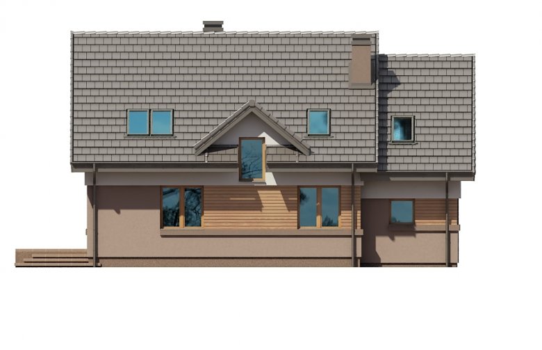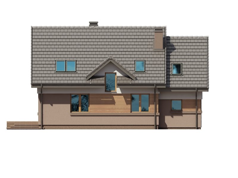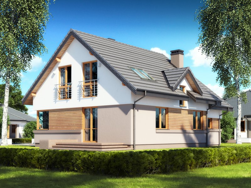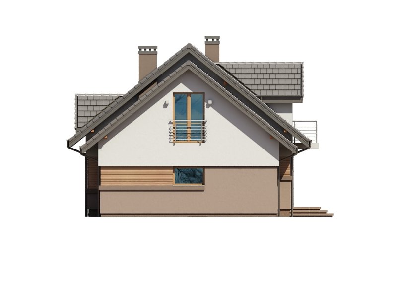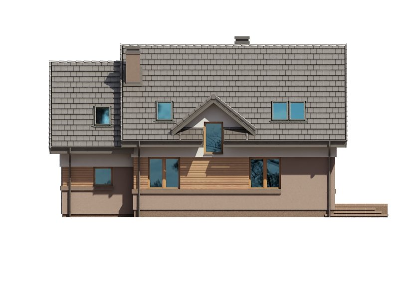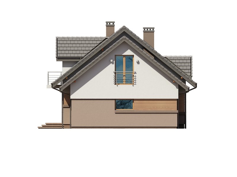 ściany zewnętrzne: tradycyjne dwuwarstwowe (pustak ceramiczny + styropian), na fragmentach szalówka drewniana lub tynk imitujący drewno