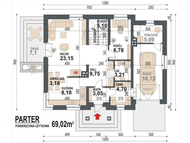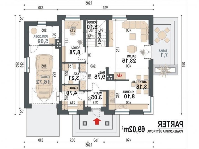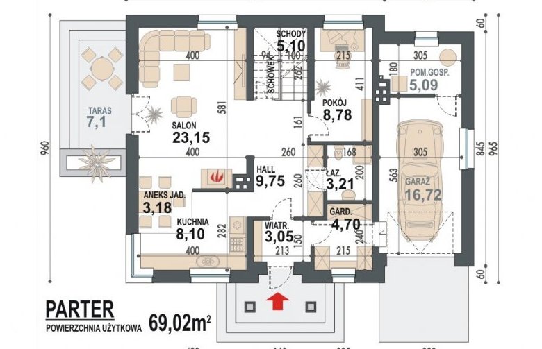 Kolargol 2N to unowocześniona wersja bardzo popularnego projektu domu Kolargol 2. Ten nieduży, o prostej budowie i dwuspadowym dachu dom otrzymał nową, nowoczesną szatę graficzną, a ponadto został wzbogacony o rozwiązania polepszające parametry energooszczędne. W parterowej części frontowej domu znajduje się kuchnia z aneksem jadalnym połączona z salonem, który usytuowano tak aby zapewnić dobrą ekspozycję zarówno w elewacji bocznej jak i tylnej. Program użytkowy parteru uzupełniają: pokój (gabinet), łazienka z prysznicem i garderoba, a ponadto garaż i kotłownia na olej lub gaz lub paliwo stałe (ekogroszek). Strefę nocną sytuowaną na poddaszu tworzą trzy pokoje przeznaczone dla dzieci oraz sypialnia rodziców z garderobą oraz łazienka. Ten niewielki gabarytowo dom spełnia wszelkie funkcje nawet dla 6-osobowej rodziny. W przypadku mniejszej liczby domowników powierzchnię poddasza można dowolnie zagospodarowywać poprzez łączenie pomieszczeń lub zmianę sposobu użytkowania np. na pokój rekreacyjny, gabinet, pralnię czy suszarnię.