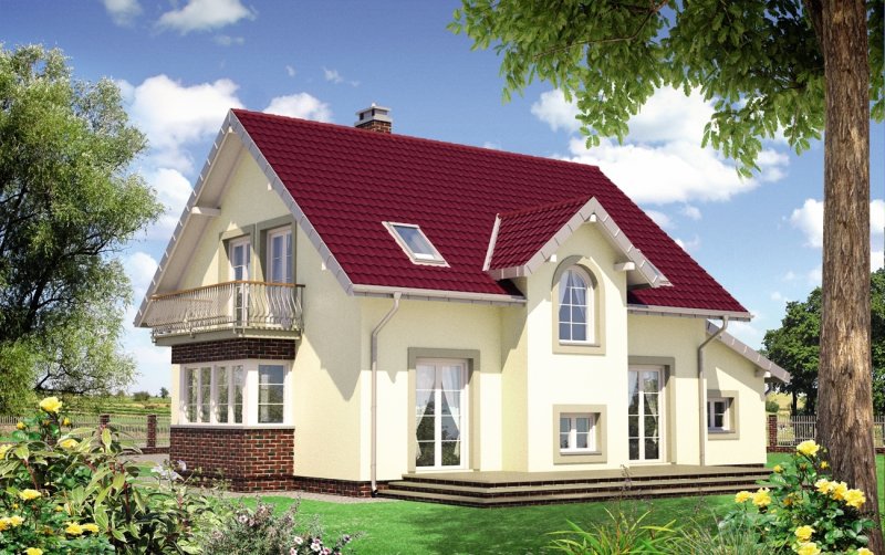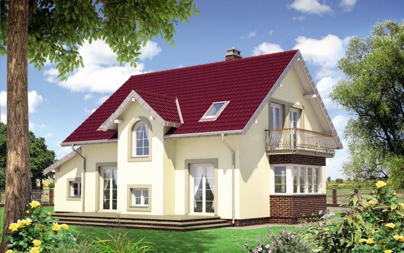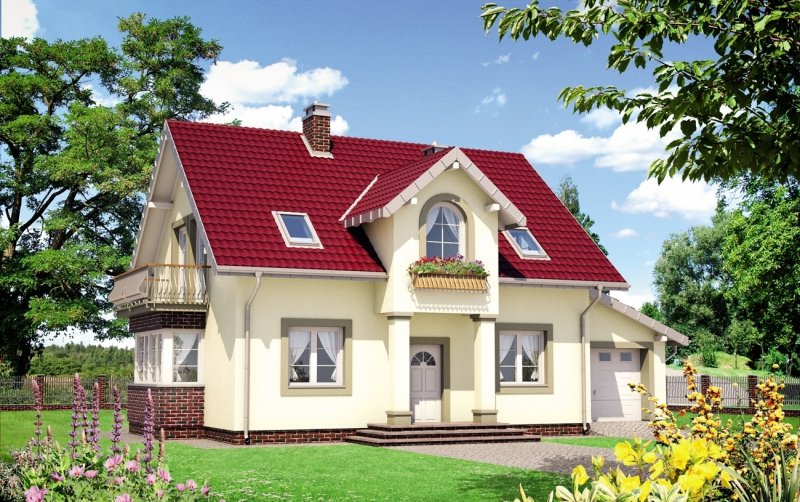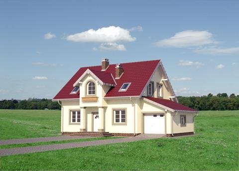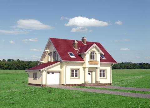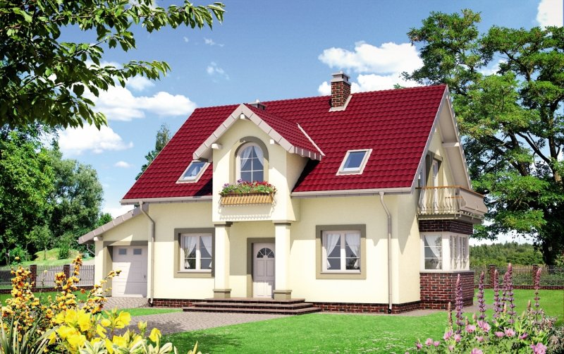 Garaż dostawiony do domu parterowego z użytkowym poddaszem nie zawsze jest wykorzystywany jako podstawa dodatkowej powierzchni mieszkalnej. Takie rozwiązanie wśród domów o powierzchni użytkowej 120-135m2 prezentuje projekt domu Kowalik Lux, a także Renata i Estera. Kowalik i Estera mają bardziej rozbudowaną bryłę od prostej, nowoczesnej Renaty, która jest ponadto podpiwniczona i proponuje taras nad garażem. W Kowaliku garaż przekryto pulpitową połacią, a część mieszkalną - bardziej stromym, dwuspadowym dachem z kalenicą równoległą do drogi dojazdowej. Symetryczną budowę bryły głównej podkreślają dwie lukarny. Wieńczą one od frontu wejściowy podcień na słupach z łazienką poddasza, a od ogrodu ryzalit mieszczący wygodną klatkę schodową ze schowkiem pod podestem. Lukarny akcentują równocześnie środkową komunikacyjną część domu, która rozdziela otwartą strefę dzienną oraz położony po drugiej stronie trakt z główną sypialnią, łazienką i przechodnią kotłownią przy garażu. Projekt domu Kowalik, jako jedyny w tej kategorii projektów z dodatkowym pokojem na parterze ma na poddaszu aż cztery sypialnie oświetlone tradycyjnymi oknami w szczytach.