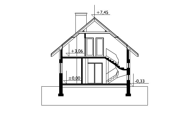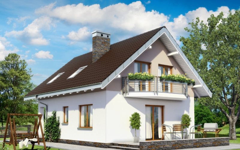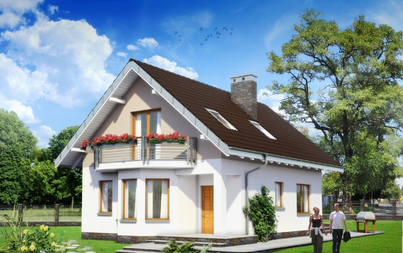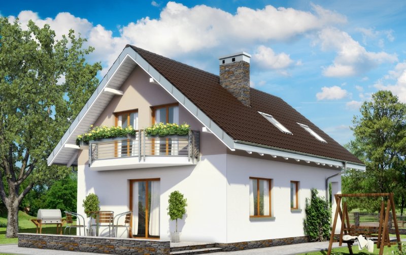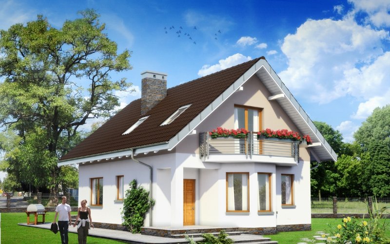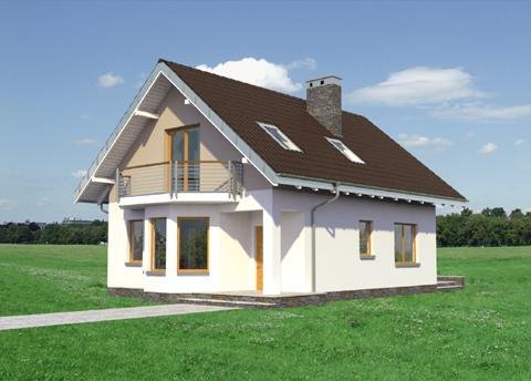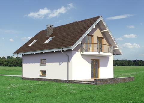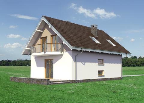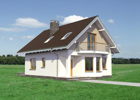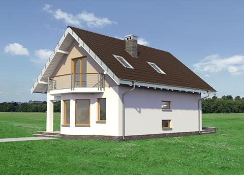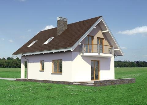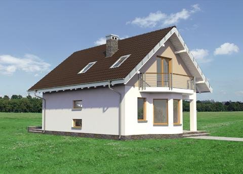 Wśród projektów małych domów parterowych z użytkowym poddaszem na wąską działkę, bez garażu, a przy tym z kalenicą prostopadłą do drogi dojazdowej tylko projekt domu Kropka proponuje od frontu fantazyjny ryzalit z nadwieszonym balkonem. Ośmioboczny zarys zagłębia się w zapraszającą wnękę wejściową ze słupem w narożniku budynku. Stąd, przez sień z kotłownią, otwiera się jednoprzestrzenna strefa wspólna mieszkania. Hol rozdziela w niej kuchnię z jadalnią oraz salon. Częściowo otwarte, oszczędne - zabiegowe schody poszerzają optycznie wydłużony salon i nadają nowoczesny, nieszablonowy kształt jego wnętrzu. Prowadzą do dwóch niewielkich i jednej obszerniejszej sypialni z garderobą oraz łazienki pod dwuspadowym dachem. Pomieszczenia doświetlono energooszczędnie – bez użycia lukarn. Tak jak złożona z podobnych elementów, ale w innej konfiguracji Calineczka, projekt domu Kropka to rozwiązanie kompromisowe. Zadowoli osoby poszukujące projektu prostego i ekonomicznego ale o architekturze dalekiej od minimalizmu.