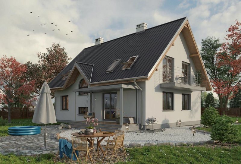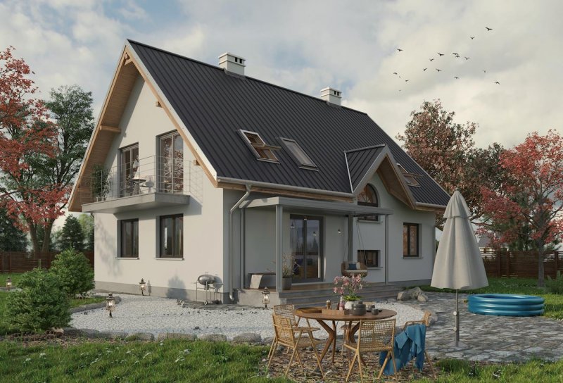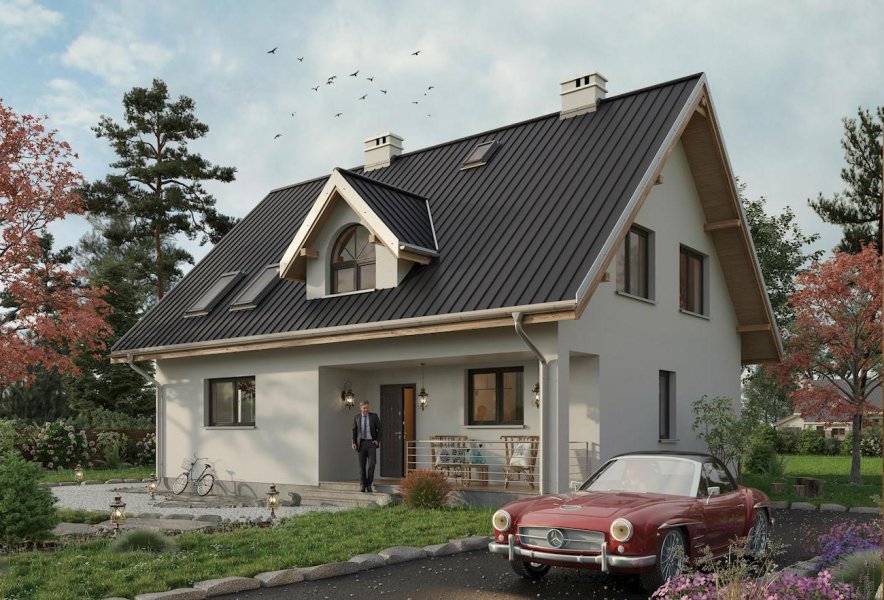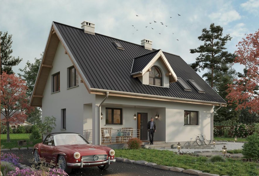 Według projektu domu Krzemyk Atu można zbudować dom średniej wielkości, z użytkowym poddaszem, bez garażu, o bardzo tradycyjnej sylwetce. Ma prostokątny rzut, dwuspadowy dach z kalenicą równoległą do drogi dojazdowej i proste detale. Są to: narożna wnęka wejściowa ze słupem i dwie małe lukarny z zamkniętym łukiem oknem w każdej z połaci. Program użytkowy wpisano w ekonomiczny układ trzech traktów konstrukcyjno - funkcjonalnych. Środkowy z nich zajmuje komunikacja, która rozdziela kuchnię z salonem od kotłowni, łazienki i dodatkowego pokoju. Pokój dzienny można zaaranżować jako mniej lub bardziej otwarte wnętrze. Trzy duże sypialnie na poddaszu wyposażono w wygodne wbudowane szafy kryjące kominy i oświetlono oknami o tradycyjnych proporcjach w symetrycznie rozrysowanych ścianach szczytowych oraz oknami dachowymi. Tylko garderoba przy łazience oraz schody mają niewielkie lukarny umieszczone na osi prostopadłej do kalenicy, akcentującej trakt wejściowy Prosta, masywna bryła bez balkonów projektu domu Krzemyk Atu nawiązuje do architektury małych miasteczek. Nieco mniejszą powierzchnię i wersję z garażem proponują inne warianty z Rodziny Krzemyka.