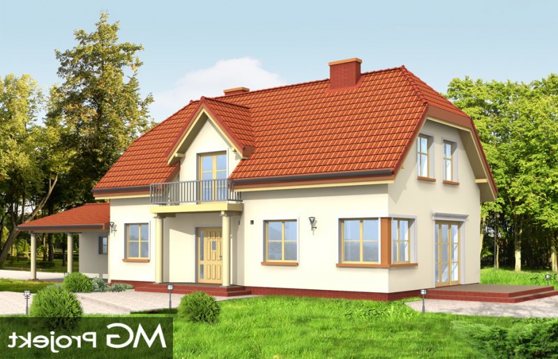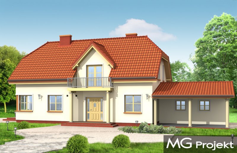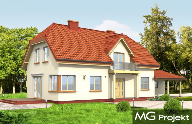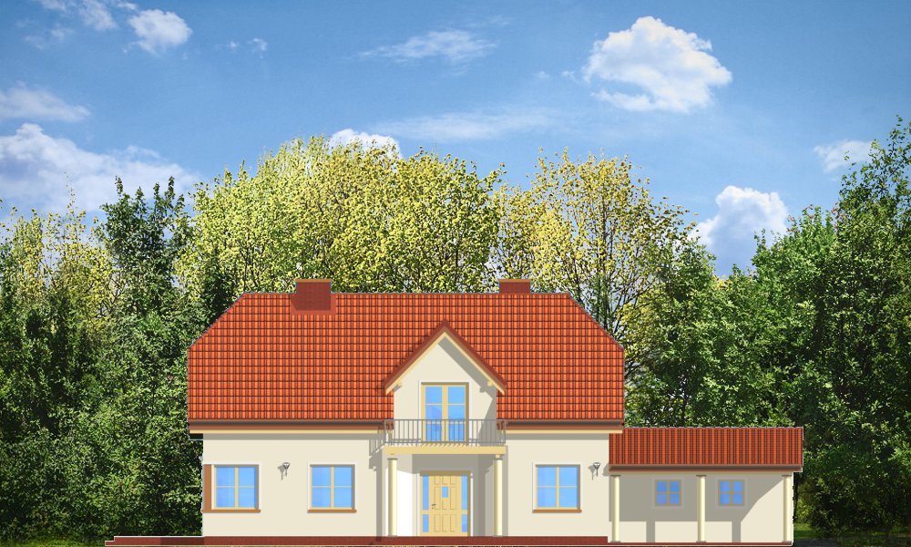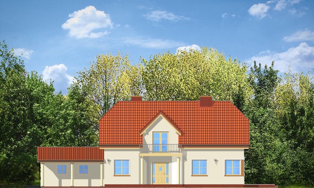 Krzysztof to willa jednorodzinna dla rodziny 4-5 osobowej. Projekt przeznaczony jest na wąską działkę, o szerokości nawet 15 m. Ozdobny fronton z balkonem i wciętym przedsionkiem oraz dach naczółkowy tworzą miłą dla oka sylwetkę domu. Dobudowane garaże w zależności od ustawienia na działce mogą mieć drzwi na stronę frontową lub na boczną. We wnętrzu na parterze zaprojektowano salon połączony z aneksem jadalnym i holem, kuchnię, oraz gabinet. Na poddaszu mieszczą się trzy sypialnie z garderobą, łazienką i dużym holem-bawialnią (z wyjściem na balkon). Projekt dostępny jest też w odbiciu lustrzanym.