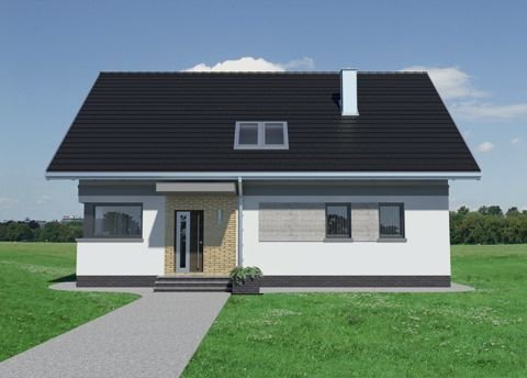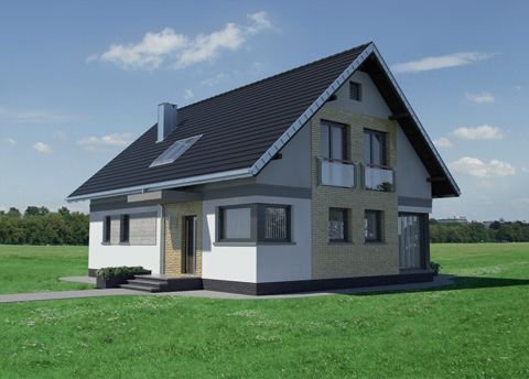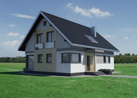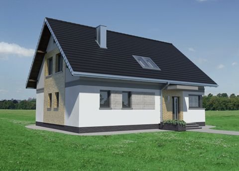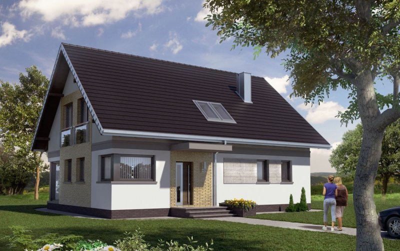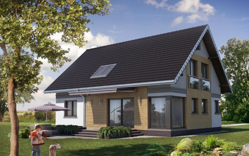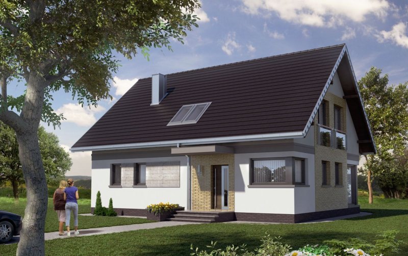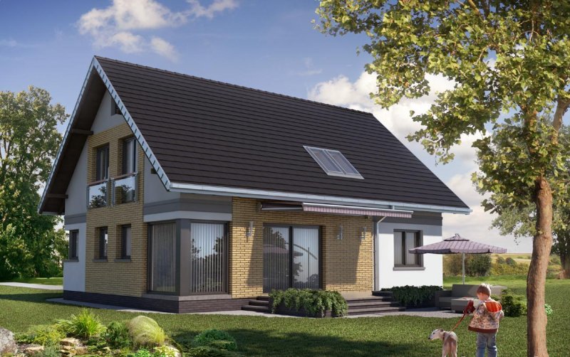 Do budowy dużego ale przy tym prostego i ekonomicznego domu o nowoczesnym wyglądzie doskonały jest projekt domu Lajkonik. Jak w przypadku każdego domu z użytkowym poddaszem i dodatkowym pokojem na parterze, wykończenie inwestycji można podzielić na etapy. Dolna kondygnacja mieści kompletne mieszkanie z dużym pokojem dziennym, łazienką i przestronną kotłownią. Układ kuchni, salonu i holu umożliwia ich zamknięcie lub pozostawienie jednoprzestrzennego wnętrza. Pod dwuspadowym dachem bez lukarn jest miejsce na cztery duże sypialnie, obszerną łazienkę i garderobę. Poddasze doświetlono niemal wyłącznie oknami w ścianach szczytowych. Wyjątek stanowi klatka schodowa i jeden pokój, które wyposażono w efektowne, zdwojone okno dachowe w każdej połaci. Takie rozwiązanie sprawia, że projekt domu Lajkonik oferuje wyjątkowo dogodne warunki dla bezproblemowej instalacji baterii słonecznych w ilości, która zapewni atrakcyjną wydajność (a przy tym pozwoli zaoszczędzić na kosztach pokrycia!) . Nowoczesnym akcentem w tradycyjnej sylwetce domu są też narożne okna i minimalistyczny daszek nad wejściem.