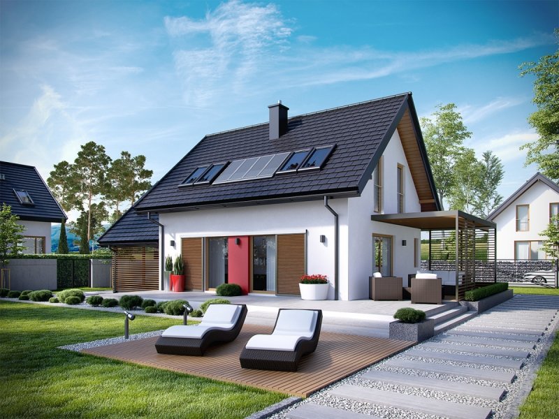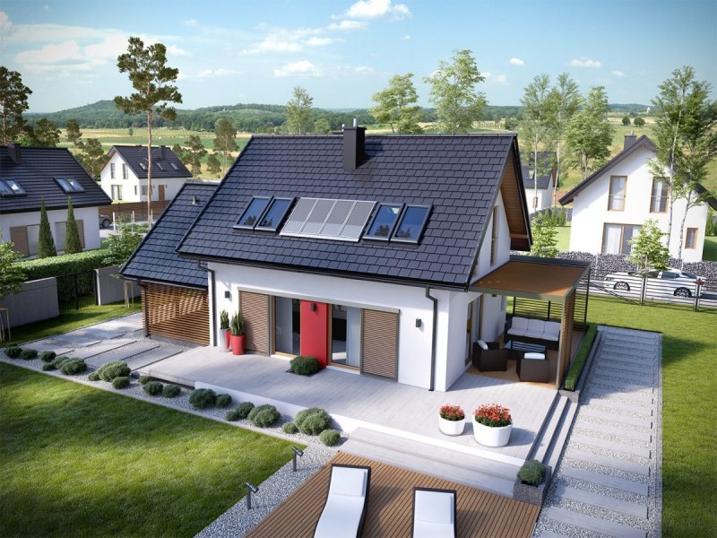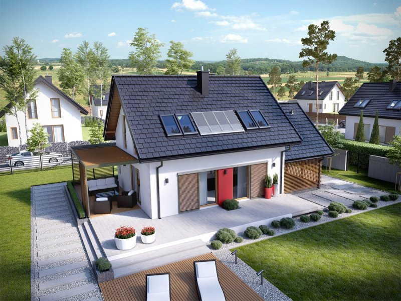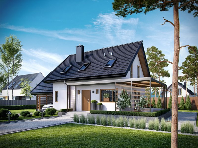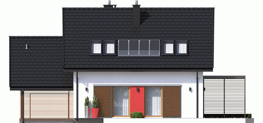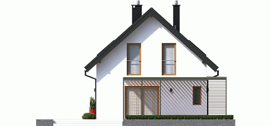Lea II (z wiatą) to piękny, rodzinny dom w którym każdy czuje się komfortowo i swobodnie. Dużym atutem projektu jest znakomite doświetlenie wszystkich pomieszczeń, które aktywnie wspiera system grzewczy i pozytywnie wpływa na zdrowie i samopoczucie domowników. Na szczególną uwagę zasługuje obszerny taras z dekoracyjną pergolą – idealne miejsce na relaks z dobrą książką, obiad na świeżym powietrzu i błogie lenistwo w promieniach zachodzącego słońca.