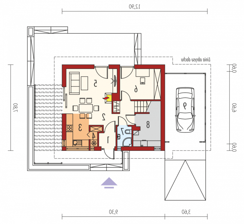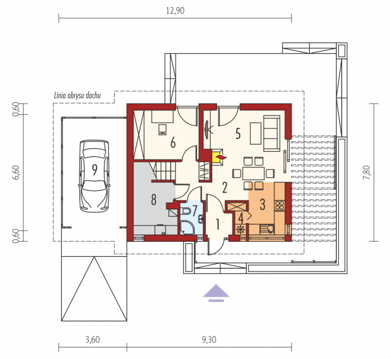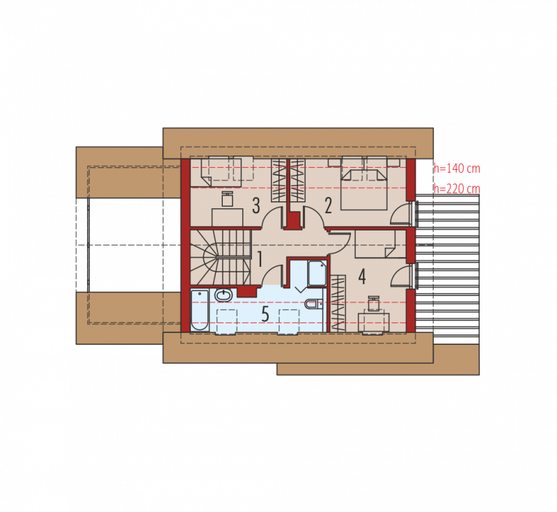Dach: konstrukcja drewniana, ocieplenie wełna mineralna 30 cm, dachówka płaska lub inna o podobnych parametrach