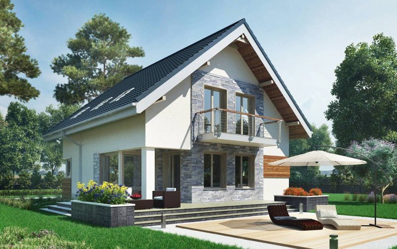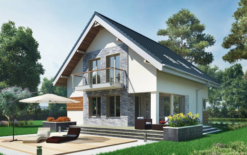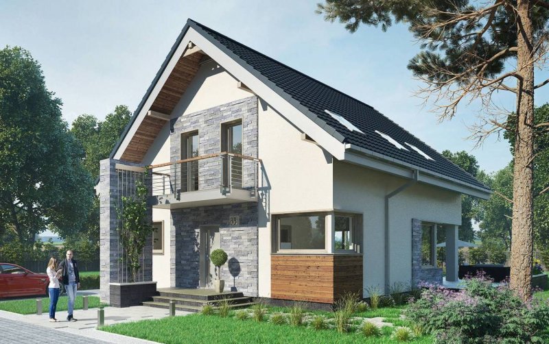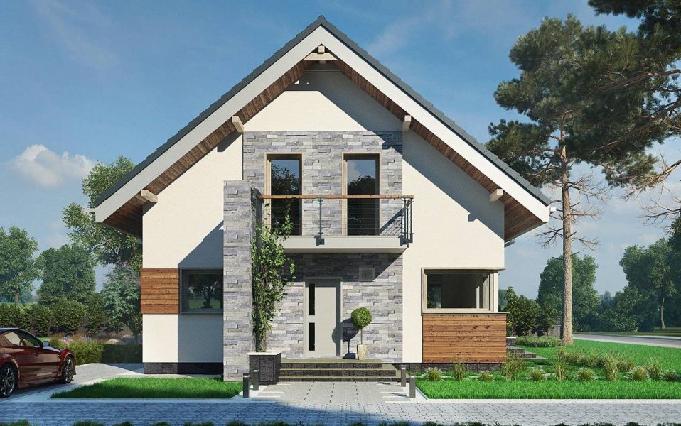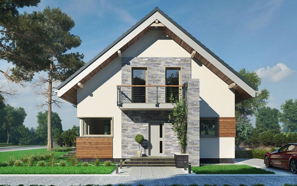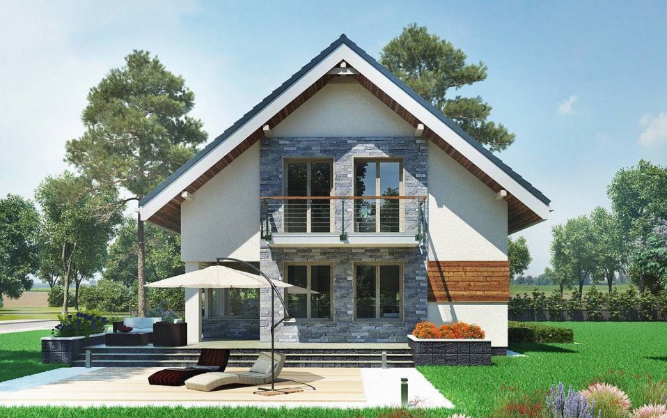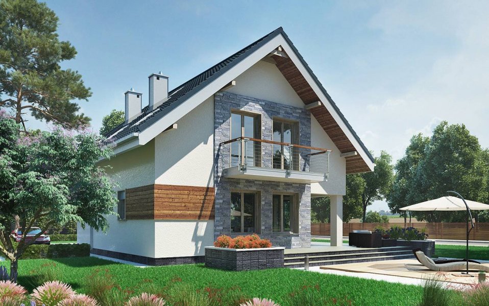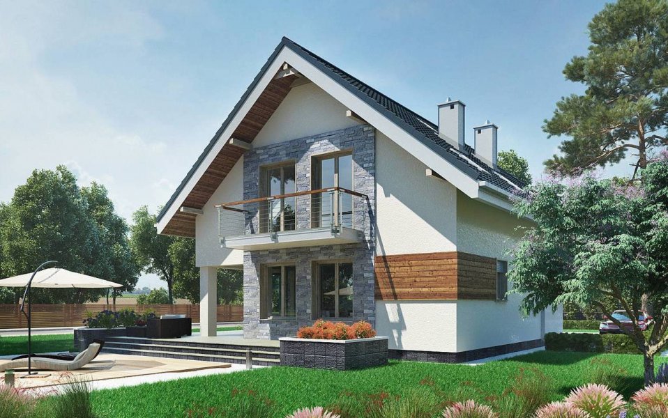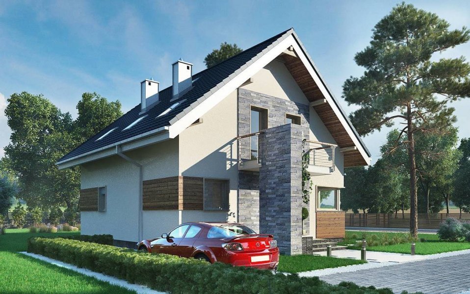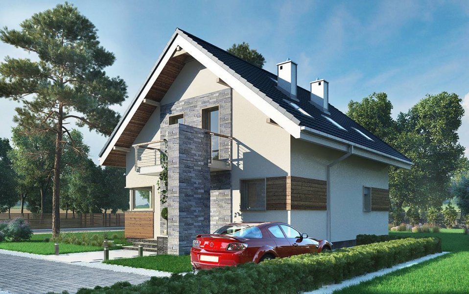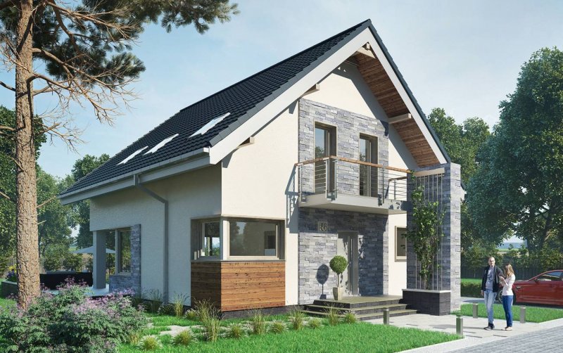 Projekt domu Leon to ekonomiczna propozycja domu parterowego z użytkowym poddaszem, o powierzchni do 120m2, bez garażu. Ma wejście pod szczytem dwuspadowego dachu, więc przy wymogu ustawienia kalenicy prostopadle do drogi dojazdowej, łatwo wpasuje się nawet w niewielką działkę. Parter zajmuje głównie jednoprzestrzenny pokój dzienny zaczynający się szerokim holem. Kuchnia jest otwarta ale oddzielona od salonu i wygodnie skomunikowana z sienią przez spiżarnię. Atutem projektu domu Leon jest duża kotłownia przy wejściu z możliwością dodatkowego powiększenia jej po rezygnacji z prysznica przy wc. Lokalizacja spiżarni i kotłowni tworzy z tych pomieszczeń doskonały bufor termiczny dla mieszkania, zwłaszcza przy ustawieniu budynku frontem na północ. Niewiele projektów o tej powierzchni co Leon umożliwia zaaranżowanie aż czterech ustawnych choć oszczędnych pokoi, przy minimalnej powierzchni komunikacji na poddaszu. Nowoczesność prostych, energooszczędnych rozwiązań akcentują narożne okna, poziome płyty balkonów wykorzystane do osłonięcia tarasów oraz parawanowa, dekoracyjna ściana akcentująca front.
