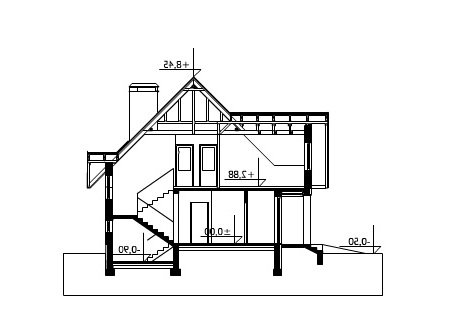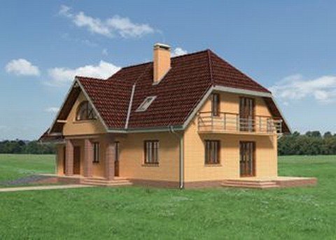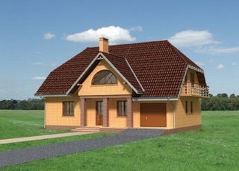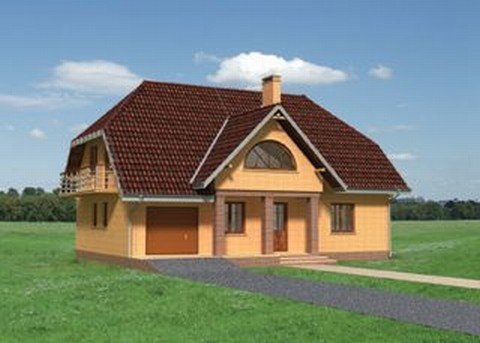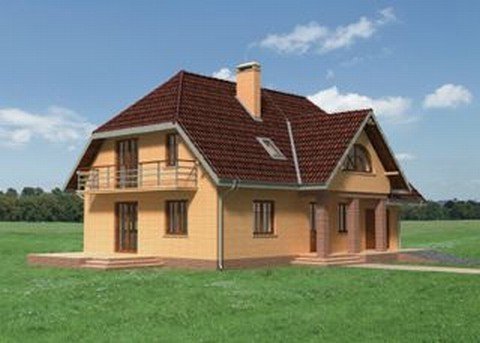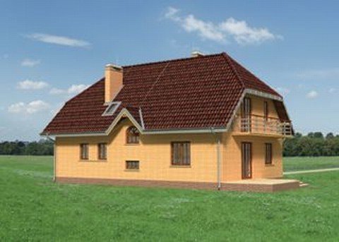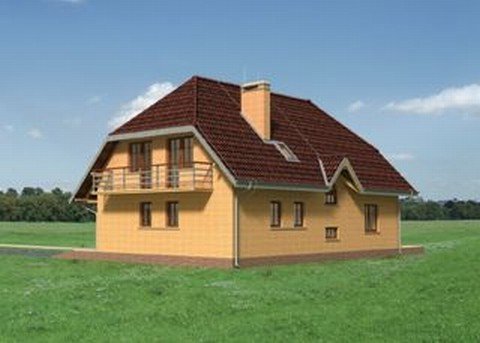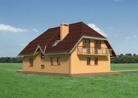 Obszerny podcień wejściowy prowadzi przez sień do centralnie zlokalizowanego holu. Z holu dostępny jest duży pokój dzienny połączony z jadalnią i kuchnią. W przeciwległej części holu znajdują się wejścia do dodatkowego pokoju, łazienki oraz korytarza łączącego część mieszkalną z gospodarczą, w której mieści się garaż i kotłownia. Prosta klatka schodowa prowadzi na poddasze, gdzie zlokalizowano łazienkę oraz 4 pokoje sypialne. Jeden z pokoi posiada oddzielną łazienkę i garderobę. Prostą bryłę budynku tworzy prostopadłościan przykryty dachem dwuspadowym z naczółkami (45°). Bryłę wzbogacają balkony oraz wysunięty podcień wejścia oparty na masywnych słupach. Uroku dodają półokrągłe okna i lukarny.