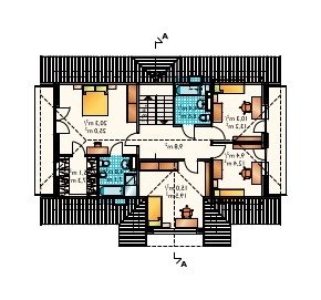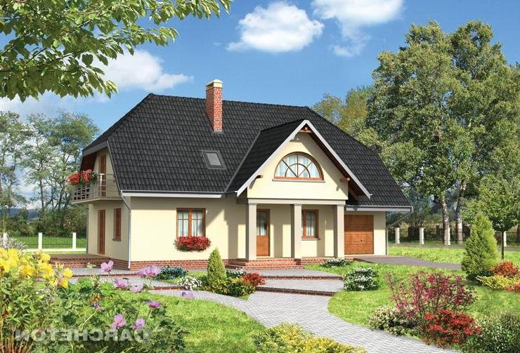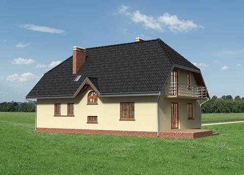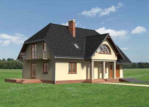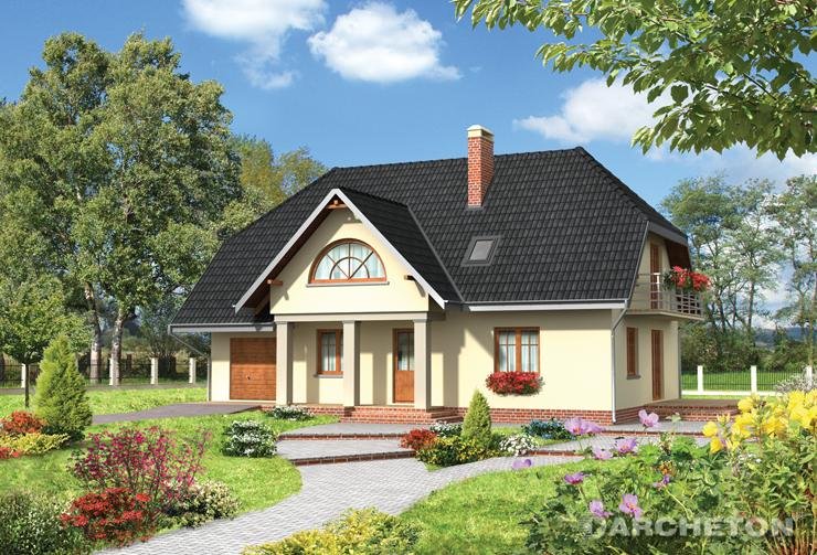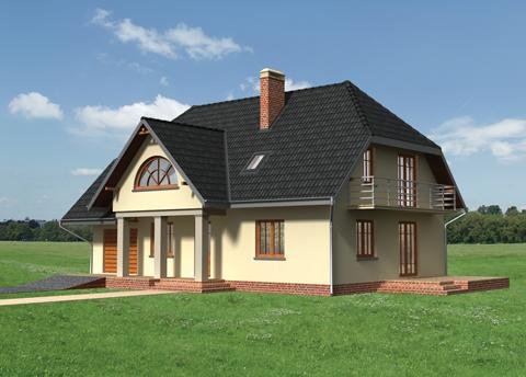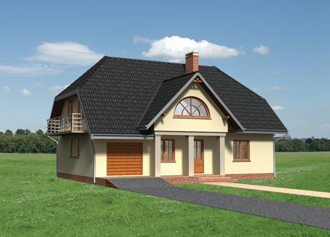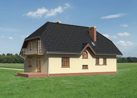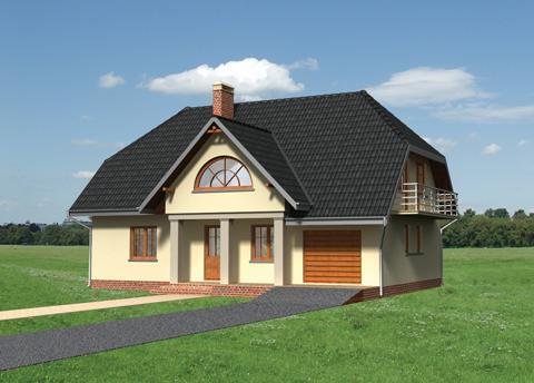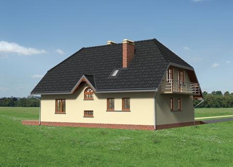 Dom parterowy, z użytkowym poddaszem, niepodpiwniczony, z garażem. Obszerny podcień wejściowy prowadzi przez sień do centralnie zlokalizowanego holu. Z holu dostępny jest duży pokój dzienny połączony z jadalnią i kuchnią. W przeciwległej części holu znajdują się wejścia do dodatkowego pokoju, łazienki oraz korytarza łączącego część mieszkalną z gospodarczą, w której mieści się garaż i kotłownia. Prosta klatka schodowa prowadzi na poddasze, gdzie zlokalizowano łazienkę oraz 4 pokoje sypialne. Jeden z pokoi posiada oddzielną łazienkę i garderobę. Prostą bryłę budynku tworzy prostopadłościan przykryty dachem dwuspadowym z naczółkami (45°). Bryłę wzbogacają balkony oraz wysunięty podcień wejścia oparty na masywnych słupach. Uroku dodają półokrągłe okna i lukarny.