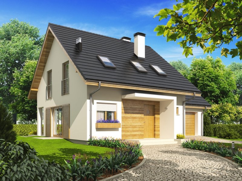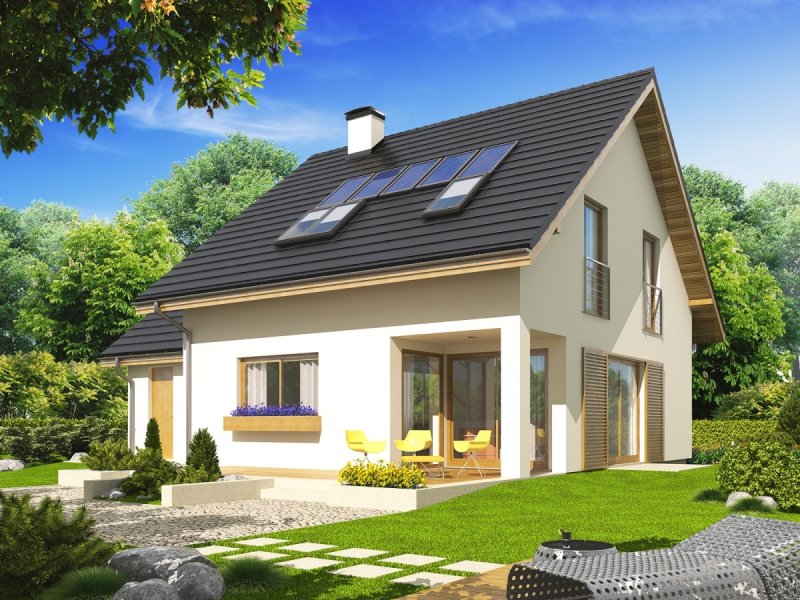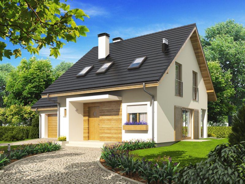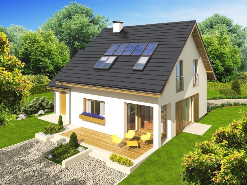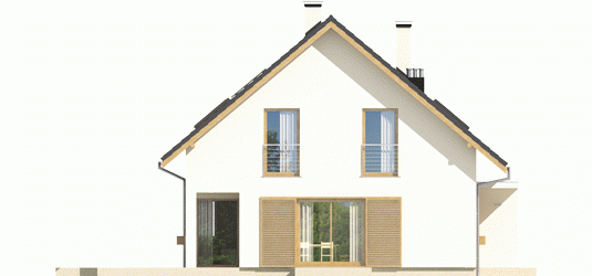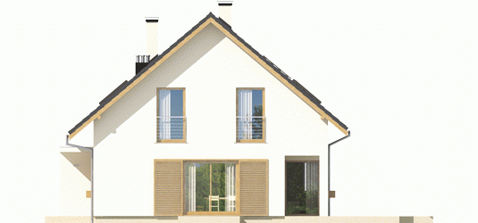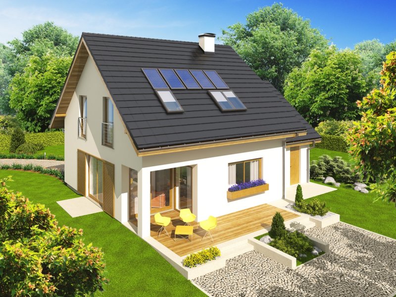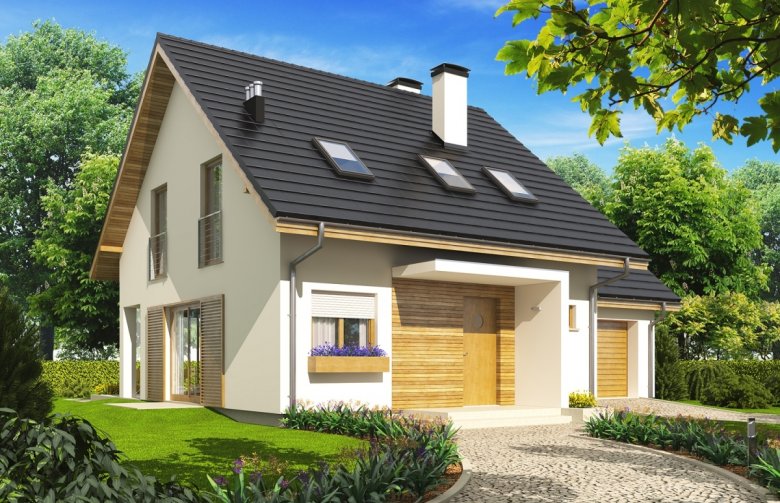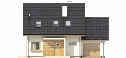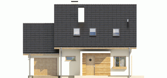 Dom zaprojektowany w technologii murowej ze stropem gęstożebrowym. Schody wewnętrzne drewniane. Dach o konstrukcji drewnianej pokryty dachówką płaską lub inną o podobnych parametrach. Elewacje wykończono tynkiem mineralnym i okładziną drewnianą. Stolarka okienna drewniana lub PCV. W projekcie zastosowano rozwiązania firmy VELUX. Rolety zewnętrzne naokienne w systemie CleverBox firmy BeClever.